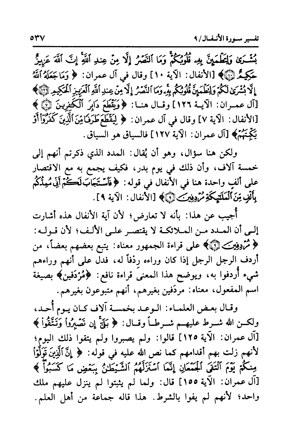 بُشْرَى وَلِتَطْمَئِنَّ بِهِ قُلُوبُكُمْ وَمَا النَّصْرُ إِلاَّ مِنْ عِندِ اللَّهِ إِنَّ اللَّهَ عَزِيزٌ حَكِيمٌ (10)} [الأنفال: الآية 10] وقال في آل عمران: {وَمَا جَعَلَهُ اللَّهُ إِلاَّ بُشْرَى لَكُمْ وَلِتَطْمَئِنَّ قُلُوبُكُم بِهِ وَمَا النَّصْرُ إِلاَّ مِنْ عِندِ اللَّهِ الْعَزِيزِ الْحَكِيمِ (126)} [آل عمران: الآية 126] وقال هنا: {وَيَقْطَعَ دَابِرَ الْكَافِرِينَ} [الأنفال: الآية 7] وقال في آل عمران: {لِيَقْطَعَ طَرَفًا مِّنَ الَّذِينَ كَفَرُواْ أَوْ يَكْبِتَهُمْ} [آل عمران: الآية 127] فالسياق هو السياق.