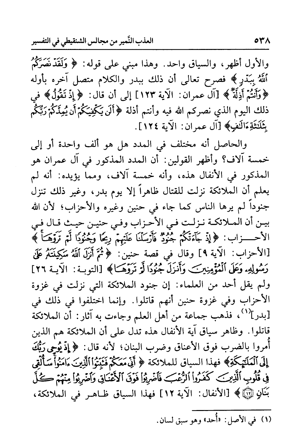 والأول أظهر، والسياق واحد. وهذا مبنيٌّ على قوله: {وَلَقَدْ نَصَرَكُمُ اللَّهُ بِبَدْرٍ} فصرح تعالى أن ذلك ببدر والكلام متصل آخره بأوله {وَأَنتُمْ أَذِلَّةٌ} [آل عمران: الآية 123] إلى أن قال: {إِذْ تَقُولُ} في ذلك اليوم الذي نصركم الله فيه وأنتم أذلة {أَلَن يَكْفِيَكُمْ أَن يُمِدَّكُمْ رَبُّكُم بِثَلاَثَةِ آلاَفٍ} [آل عمران: الآية 124].