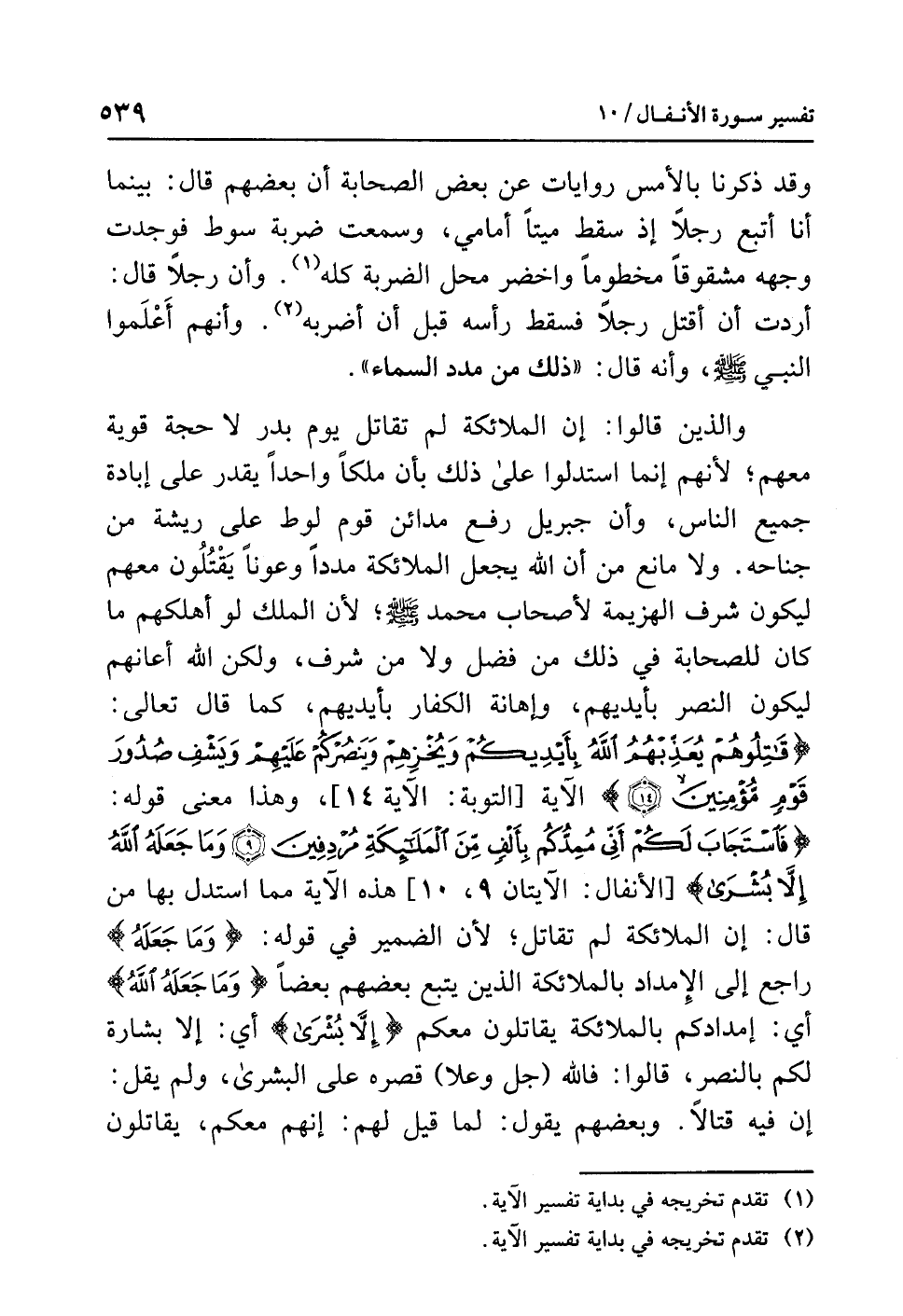 والذين قالوا: إن الملائكة لم تقاتل يوم بدر لا حجة قوية معهم؛ لأنهم إنما استدلوا على ذلك بأن ملكًا واحدًا يقدر على إبادة جميع الناس، وأن جبريل رفع مدائن قوم لوط على ريشة من جناحه، ولا مانع من أن الله يجعل الملائكة مددًا وعونًا يَقْتُلُون معهم ليكون شرف الهزيمة لأصحاب محمد صلى الله عليه وسلم؛ لأن الملك لو أهلكهم ما كان للصحابة في ذلك من فضل ولا من شرف، ولكن الله أعانهم ليكون النصر بأيديهم، وإهانة الكفار بأيديهم، كما قال تعالى: {قَاتِلُوهُمْ يُعَذِّبْهُمُ اللَّهُ بِأَيْدِيكُمْ وَيُخْزِهِمْ وَيَنصُرْكُمْ عَلَيْهِمْ وَيَشْفِ صُدُورَ قَوْمٍ مُّؤْمِنِينَ (14)} الآية [التوبة: الآية 14]، وهذا معنى قوله: {فَاسْتَجَابَ لَكُمْ أَنِّي مُمِدُّكُم بِأَلْفٍ مِّنَ الْمَلآئِكَةِ مُرْدِفِينَ وَمَا جَعَلَهُ اللَّهُ إِلاَّ بُشْرَى} [الأنفال: الآيتان 9، 10] هذه الآية مما استدل بها من قال: إن الملائكة لم تقاتل؛ لأن الضمير في قوله: {وَمَا جَعَلَهُ} راجع إلى الإمداد بالملائكة الذين يتبع بعضهم بعضًا {وَمَا جَعَلَهُ اللَّهُ} أي: إمدادكم بالملائكة يقاتلون معكم {إِلاَّ بُشْرَى} أي: إلا بشارة لكم بالنصر، قالوا: فالله (جل وعلا) قصره على البشرى، ولم يقل: إن فيه قتالاً. وبعضهم يقول: لما قيل لهم: إنهم معكم، يقاتلون