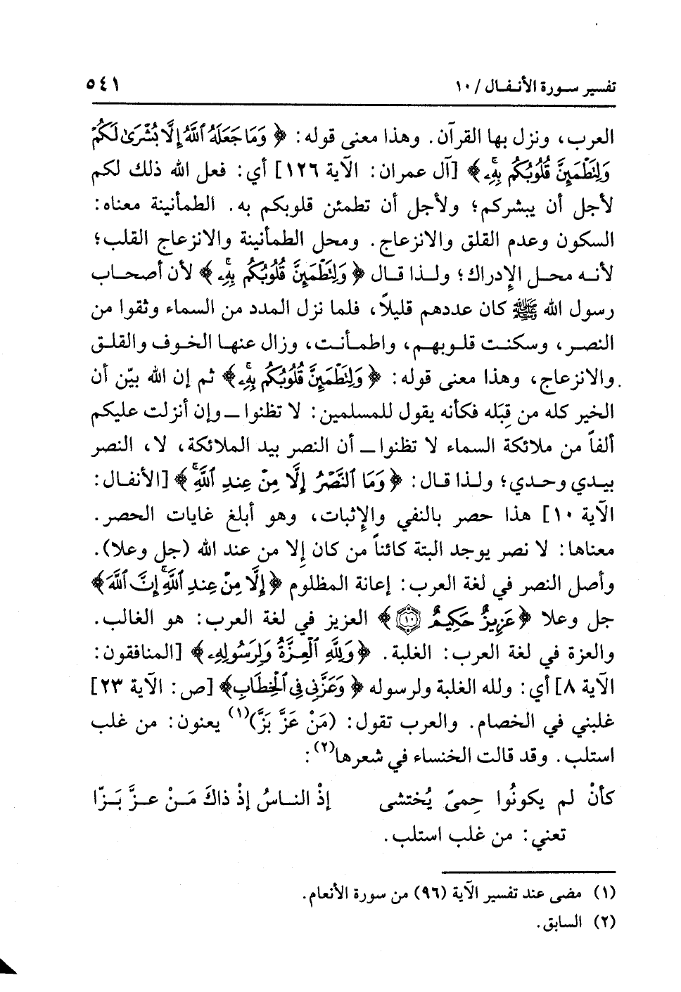 العرب، ونزل بها القرآن. وهذا معنى قوله: {وَمَا جَعَلَهُ اللَّهُ إِلاَّ بُشْرَى لَكُمْ وَلِتَطْمَئِنَّ قُلُوبُكُم بِهِ} [آل عمران: الآية 126] أي: فعل الله ذلك لكم لأجل أن يبشركم؛ ولأجل أن تطمئن قلوبكم به. الطمأنينة معناها: السكون وعدم القلق والانزعاج. ومحل الطمأنينة والانزعاج: القلب؛ لأنه محل الإدراك؛ ولذا قال: {وَلِتَطْمَئِنَّ قُلُوبُكُم بِهِ} لأن أصحاب رسول الله صلى الله عليه وسلم كان عددهم قليلاً، فلما نزل المدد من السماء وثقوا من النصر، وسكنت قلوبهم، واطمأنت، وزال عنها الخوف والقلق والانزعاج، وهذا معنى قوله: {وَلِتَطْمَئِنَّ قُلُوبُكُم بِهِ} ثم إن الله بيّن أن الخير كله من قِبَله فكأنه يقول للمسلمين: لا تظنوا -وإن أنزلت عليكم ألفًا من ملائكة السماء- أن النصر بيد الملائكة! لا، النصر بيدي وحدي؛ ولذا قال: {وَمَا النَّصْرُ إِلاَّ مِنْ عِندِ اللَّهِ} [الأنفال: الآية 10] هذا حصر بالنفي والإثبات، وهو أبلغ غايات الحصر. معناها: لا نصر يوجد ألبتة كائنًا من كان إِلا من عند الله (جل وعلا). وأصل النصر في لغة العرب: إعانة المظلوم {إِلاَّ مِنْ عِندِ اللَّهِ إِنَّ اللَّهَ} جل وعلا {عَزِيزٌ حَكِيمٌ} العزيز في لغة العرب: هو الغالب. والعزة في لغة العرب: الغلبة {وَلِلَّهِ الْعِزَّةُ وَلِرَسُولِهِ} [المنافقون: الآية 8] أي: ولله الغلبة ولرسوله {وَعَزَّنِي فِي الْخِطَابِ} [ص: الآية 23] غلبني في الخصام. والعرب تقول: (مَنْ عَزَّ بَزَّ) (¬1) يعنون: من غلب استلب. وقد قالت الخنساء في شعرها (¬2):