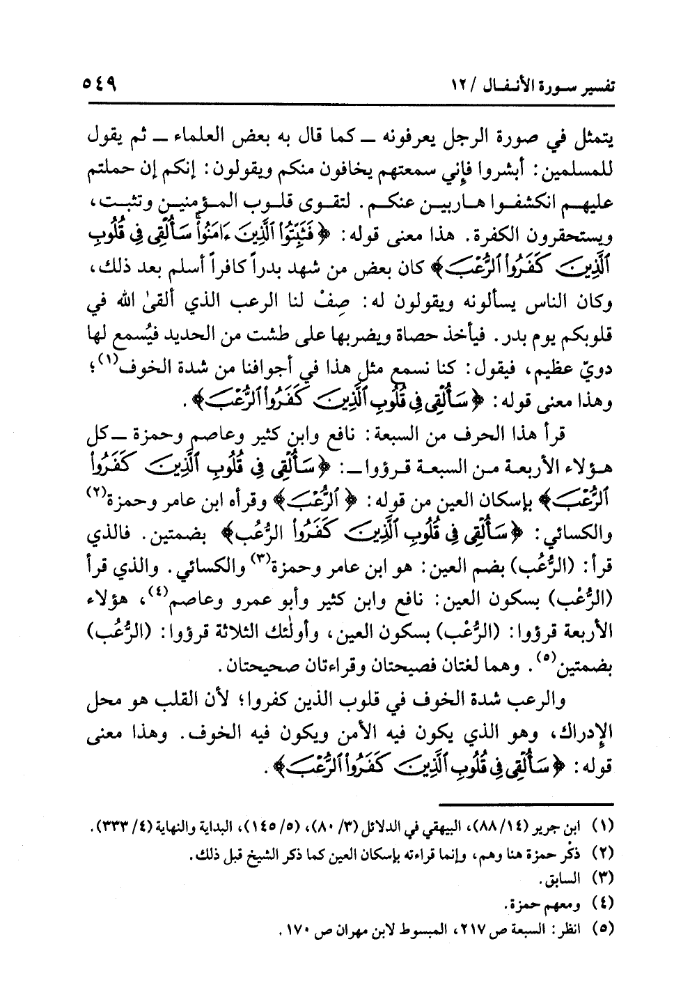 قرأ هذا الحرف من السبعة: نافع، وابن كثير، وعاصم، وحمزة - كل هؤلاء الأربعة - من السبعة قرؤوا: {سَأُلْقِي فِي قُلُوبِ الَّذِينَ كَفَرُواْ الرُّعْبَ} بإسكان العين من قوله: {الرُّعْبَ} وقرأه ابن عامر، وحمزة (¬2)، والكسائي: {سَأُلْقِي فِي قُلُوبِ الَّذِينَ كَفَرُواْ الرُّعُبَ} بضمتين. فالذي قرأ: (الرُّعُب) بضم العين: هو ابن عامر، وحمزة (¬3)، والكسائي. والذي قرأ (الرُّعْب) بسكون العين: نافع، وابن كثير، وأبو عمرو، وعاصم (¬4)، هؤلاء الأربعة قرؤوا: (الرعْب) بسكون العين، وأولئك الثلاثة قرءوا: (الرُّعُب) بضمتين (¬5). وهما لغتان فصيحتان وقراءتان صحيحتان.