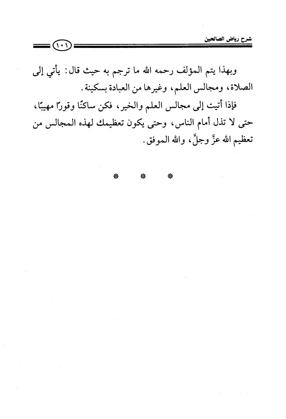 وبهذا يتم المؤلف رحمه الله ما ترجم به من الندب إلى إتيان الصلاة ومجالس العلم وغيرها من العبادة بسكينة ووقار فإذا أتيت إلى مجالس العلم والخير فكن ساكنا وقورا مهيبا حتى لا يستهان بك أمام الناس ويكون تعظيمك لهذه المجالس من تعظيم الله عز وجل
