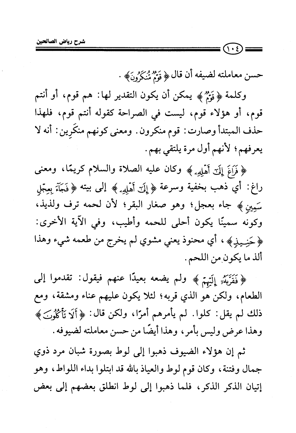 حسن معاملته لضيفه أن قال:} قوم منكرون {وقوم لو أخذناها هكذا لكان يمكن أن يكون التقدير هم قوم أو أنتم قوم أو هؤلاء قوم ليست في الصراحة كقوله أنتم قوم فلهذا حذف المبتدأ وصارت:} قوم منكرون {ومعنى كونهم منكرين أنه لا يعرفهم لأنه أول مرة يلتقي بهم} فراغ إلى أهله {وكان عليه السلام كريما ومعنى راغ: أي ذهب بسرعة وخفية} إلى أهله {أي إلى بيته} فجاء بعجل سمين {جاء بعجل، وهي صغار البقر، لأن لحمه خفيف ولذيذ وكونه سمينا يكون أحلى للحمه وأطيب، وفي الآية الأخرى أنه جاء بعجل حينئذ، أي محنوذ يعني مشوي لم يخرج من طعمه شيء وهذا ألذ ما يكون من اللحم} فقربه إليهم {ولم يضعه بعيدا عنهم فيقول: تقدموا إلى الطعام، ولكن هو الذي قربه لئلا يكون عليهم عناء ومشقة ومع ذلك لم يقل كلوا هكذا بصيغه الأمر ولكن قال:} ألا تأكلون {وهذا عرض وليس بأمر وهو أيضا من حسن معاملته لضيوفه ثم إن هؤلاء الضيوف ذهبوا إلى لوط بصورة شبان مرد ذوي جمال وفتنة وكان قوم لوط والعياذ بالله قد ابتلوا بداء اللواط وهو إتيان الذكر الذكر، فلما ذهبوا إلى لوط انطلق بعضهم إلى بعض