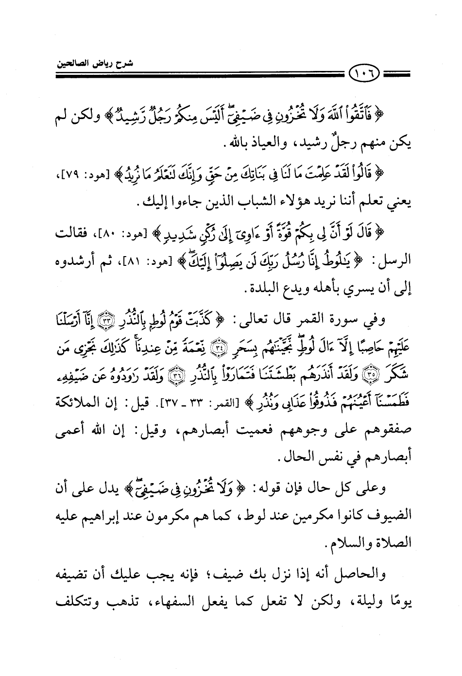 فَاتَّقُوا اللهَ وَلاَ تُخْزُونِ فِي ضَيْفِي أَلَيْسَ مِنْكُمْ رَجُلٌ رَّشِيدٌ {ولكن لم يكن منهم رجل رشيد والعياذ بالله} قَالُوا لَقَدْ عَلِمْتَ مَا لَنَا فِي بَنَاتِكَ مِنْ حَقٍّ وَإِنَّكَ لَتَعْلَمُ مَا نُرِيدُ {يعني تعلم أننا نريد هؤلاء الشباب الذين جاءوا إليك} قَالَ لَوْ أَنَّ لِي بِكُمْ قُوَّةً أَوْ آوِي إِلَى رُكْنٍ شَدِيدٍ {فقالت الرسل} يَا لُوطُ إِنَّا رُسُلُ رَبِّكَ لَن يَصِلُوا إِلَيْكَ {ثم أرشدوه إلى أن يسري بأهله ويدع البلدة وفي سورة القمر قال تعالى:} كَذَّبَتْ قَوْمُ لُوطٍ بِالنُّذُرِ إِنَّا أَرْسَلْنَا عَلَيْهِمْ حَاصِبًا إِلاَّ آلَ لُوطٍ نَّجَّيْنَاهُم بِسَحَرٍ نِعْمَةً مِّنْ عِنْدِنَا كَذَلِكَ نَجْزِي مَن شَكَرَ وَلَقَدْ أَنذَرَهُمْ بَطْشَتَنَا فَتَمَارَوْا بِالنُّذُرِ وَلَقَدْ رَاوَدُوهُ عَن ضَيْفِهِ فَطَمَسْنَا أَعْيُنَهُمْ فَذُوقُوا عَذَابِي وَنُذُرِ {قيل إن الملائكة صفقوهم على وجوههم فعميت أبصارهم وقيل إن الله أعمى أبصارهم في نفس الحال وعلى أي حال فإن قوله:} ولا تخزون في ضيفي {يدل على أن الضيوف كانوا مكرمين عند لوط كما هم مكرمون عنه إبراهيم عليه الصلاة والسلام والحاصل أنك إذا نزل بك ضيف فإنه يجب عليك أن تضيفه يوما وليلة ولكن لا تفعل كما يفعل السفهاء تذهب وتتكلف