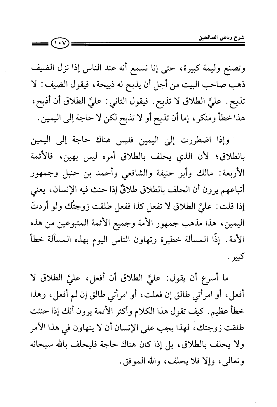 وتصنع وليمة كبيرة ترمى معظمها حتى إنا نسمع عن بعض الناس أنه إذا نزل به الضيف ذهب صاحب البيت من أجل أن يذبح له ذبيحة فيقول الضيف لا تذبح على الطلاق ما تذبح فيقول الثاني على الطلاق أن أذبح هذا غلط ومنكر فلا حاجة إلى اليمين في ذلك إما أن تذبح وإما أن لا تذبح وإذا اضطررت إلى اليمين فليس هناك حاجة إلى اليمين بالطلاق لأن الحلف بالطلاق أمره ليس بالهين فالأئمة الأربعة: مالك وأبو حنيفة والشافعي وأحمد بن حنبل وجمهور أتباعهم يرون أن الحلف بالطلاق طلاق إذا حنث فيه الإنسان يعني إذا قلت علي الطلاق ما تفعلين كذا ففعلت طلقت زوجتك ولو أردت اليمين هذا مذهب جمهور الأمة وجميع الأئمة المتبوعين من هذه الأمة إذا المسألة خطيرة وتهاون الناس بهذه المسألة غلط كبير ما أسرع أن يقول الإنسان على الطلاق أن أفعل على الطلاق ما أفعل أو امرأتي طالق إن فعلت أو امرأتي طالق إن لم أفعل وهذا غلط عظيم كيف تقول هذا الكلام وأكثر الأئمة يرون أنك إذا حنثت طلقت امرأتك}