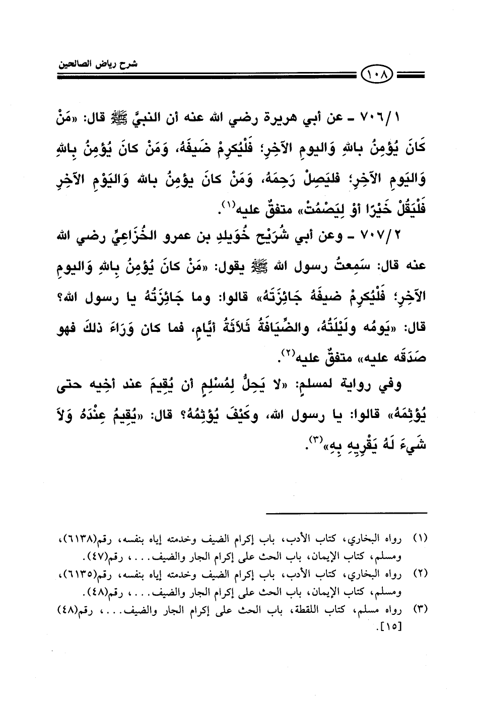 707 - وعن أبى شريح خويلد بن عمرو الخزاعي رضي الله عنه قال سمعت رسول الله صلى الله عليه وسلم يقول: من كان يؤمن بالله واليوم الآخر فليكرم ضيفه جائزته قالوا وما جائزته يا رسول الله؟ قال: يومه وليلته والضيافة ثلاثة أيام فما كان وراء ذلك فهو صدقة متفق عليه وفي رواية لمسلم: لا يحل لمسلم أن يقيم عند أخيه حتى يؤثمه قالوا يا رسول الله وكيف يؤثمه قال: يقيم عنده ولا شيء له يقريه به