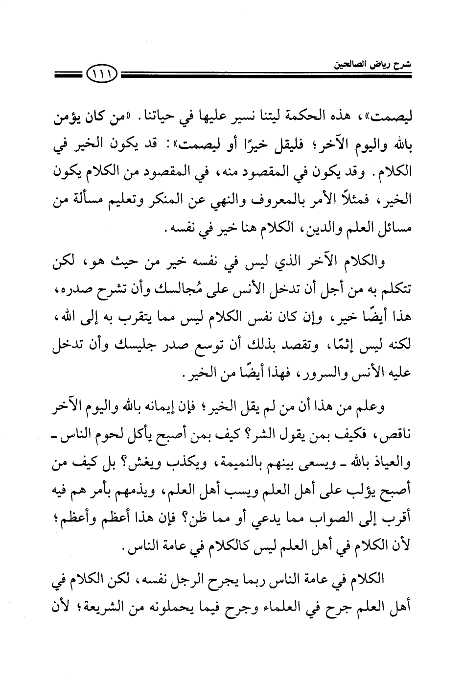 ليصمت ويا ليتنا نسير على ذلك في حياتنا من كان يؤمن بالله واليوم الآخر فليقل خيرا أو ليصمت وقد يكون نفس الكلام خيرا وقد يكون الخير في المقصود منه فمثلا الأمر بالمعروف والنهي عن المنكر وتعليم مسالة من مسائل العلم والدين الكلام هنا خير في نفسه والكلام الآخر الذي ليس في نفسه خير من حيث هو لكن تتكلم به من أجل أن تدخل الإنس على مجالسك وأن تنشرح صدره هذا أيضا خير وإن كان نفس الكلام ليس مما يتقرب به إلى الله لكنه ليس إثما وتقصد بذلك أو توسع صدر جليسك وأن تدخل عليه الأنس والسرور فهذا أيضا من الخير وعلم من هذا أن من لم يقل الخير فإن إيمانه بالله واليوم الآخر يكون ناقصا فكيف بمن يقول الشر؟ وكيف بمن أصبح يأكل لحوم الناس والعياذ بالله ويسعى بينهم بالنميمة ويكذب ويغش؟ بل كيف من أصبح يؤلب على أهل العلم ويسب أهل العلم ويذمهم بأمرهم فيه أقرب إلى الصواب مما يظن؟ فإن هذا أعظم وأعظم لأن الكلام في أهل العلم ليس كالكلام في عامة الناس الكلام في عامة الناس ربما يجرح الرجل نفسه، لكن الكلام في أهل العلم جرح في العلماء وجرح فيما يحملونه من الشريعة، لأن