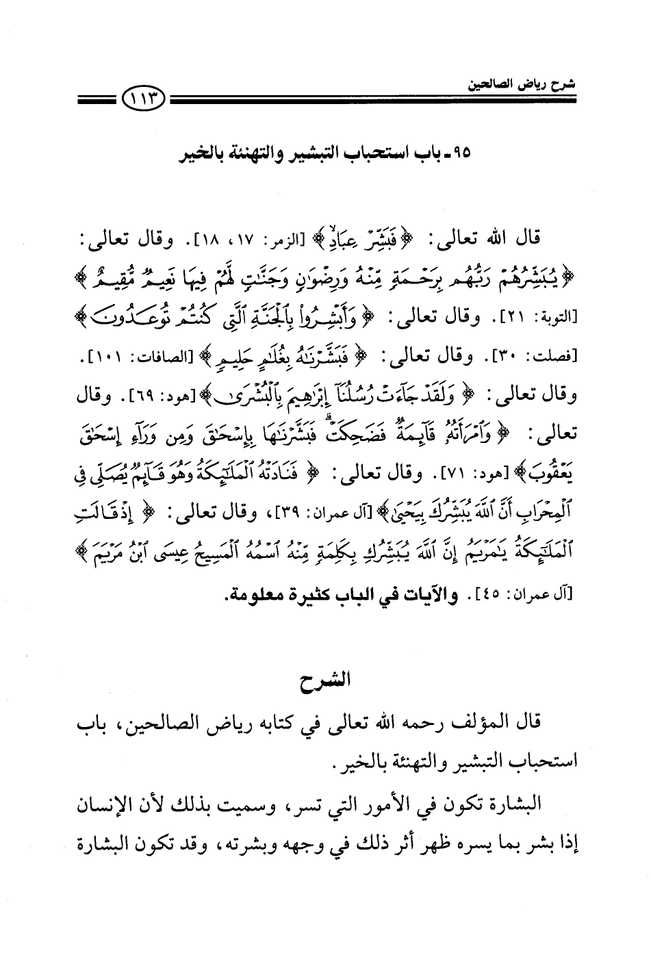 قال الله تعالى: {فَبَشِّرْ عِبَادِ الَّذِينَ يَسْتَمِعُونَ الْقَوْلَ فَيَتَّبِعُونَ أَحْسَنَهُ} وقال تعالى: {يُبَشِّرُهُمْ رَبُّهُمْ بِرَحْمَةٍ مِّنْهُ وَرِضْوَانٍ وَجَنَّاتٍ لَّهُمْ فِيهَا نَعِيمٌ مُّقِيمٌ} وقال تعالى: {وَأَبْشِرُوا بِالْجَنَّةِ الَّتِي كُنْتُمْ تُوعَدُونَ} وقال تعالى: {فبشرناه بغلام حليم} وقال تعالى: {ولقد جاءت رسلنا إبراهيم بالبشرى} وقال تعالى: {وَامْرَأَتُهُ قَائِمَةٌ فَضَحِكَتْ فَبَشَّرْنَاهَا بِإِسْحَاقَ وَمِن وَرَاءِ إِسْحَاقَ يَعْقُوبَ} وقال تعالى: {فَنَادَتْهُ الْمَلاَئِكَةُ وَهُوَ قَائِمٌ يُصَلِّي فِي الْمِحْرَابِ أَنَّ اللهَ يُبَشِّرُكَ بِيَحْيَى} وقال تعالى: {إِذْ قَالَتِ الْمَلاَئِكَةُ يَا مَرْيَمُ إِنَّ اللهَ يُبَشِّرُكِ بِكَلِمَةٍ مِّنْهُ اسْمُهُ الْمَسِيحُ} والآيات في الباب كثيرة معلومة