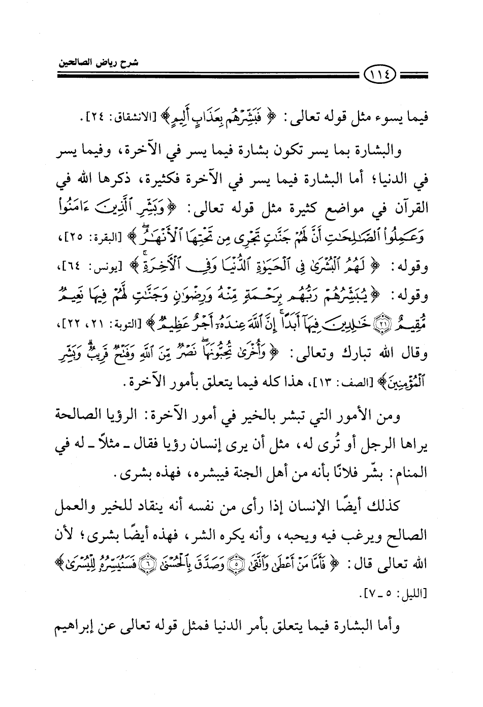فيما يسوء مثل قوله تعالى: فبشرهم بعذاب أليم والبشارة فيما يسر تكون فيما يسر في الآخرة، وفيما يسر في الدنيا، أما البشارة فيما يسر في الآخرة فكثيرة، ذكرها الله في القرآن في مواضع كثيرة مثل قوله تعالى: {وَبَشِّرِ الَّذِينَ آمَنُوا وَعَمِلُوا الصَّالِحَاتِ أَنَّ لَهُمْ جَنَّاتٍ تَجْرِي مِن تَحْتِهَا الأنْهَارُ} وقوله: {لَهُمُ الْبُشْرَى فِي الْحَيَاةِ الدُّنْيَا وَفِي الآَخِرَةِ} وقوله: {يُبَشِّرُهُمْ رَبُّهُمْ بِرَحْمَةٍ مِّنْهُ وَرِضْوَانٍ وَجَنَّاتٍ لَّهُمْ فِيهَا نَعِيمٌ مُّقِيمٌ خَالِدِينَ فِيهَا أَبَدًا إِنَّ اللهَ عِنْدَهُ أَجْرٌ عَظِيمٌ} وقال الله تعالى: {وَأُخْرَى تُحِبُّونَهَا نَصْرٌ مِّن اللهِ وَفَتْحٌ قَرِيبٌ وَبَشِّرِ الْمُؤْمِنِينَ} هذا كله فيما يتعلق بأمور الآخرة ومن الأمور التي تبشر بالخير في أمور الآخرة: الرؤيا الصالحة يراها الرجل أو ترى له، مثل أن يرى إنسان رؤيا فيقال له في المنام مثلا: بشر فلانا بأنه من أهل الجنة فبشره هذه بشرى كذلك أيضا الإنسان إذا رأى من نفسه أنه ينقاد للخير والعمل الصالح ويرغب فيه ويحبه وأنه يكره الشر فهذه أيضا بشرى لأن الله تعالى قال: {فَأَمَّا مَنْ أَعْطَى وَاتَّقَى وَصَدَّقَ بِالْحُسْنَى فَسَنُيَسِّرُهُ لِلْيُسْرَى} وأما البشارة فيما يتعلق بأمر الدنيا فمثل قوله تعالى عن إبراهيم