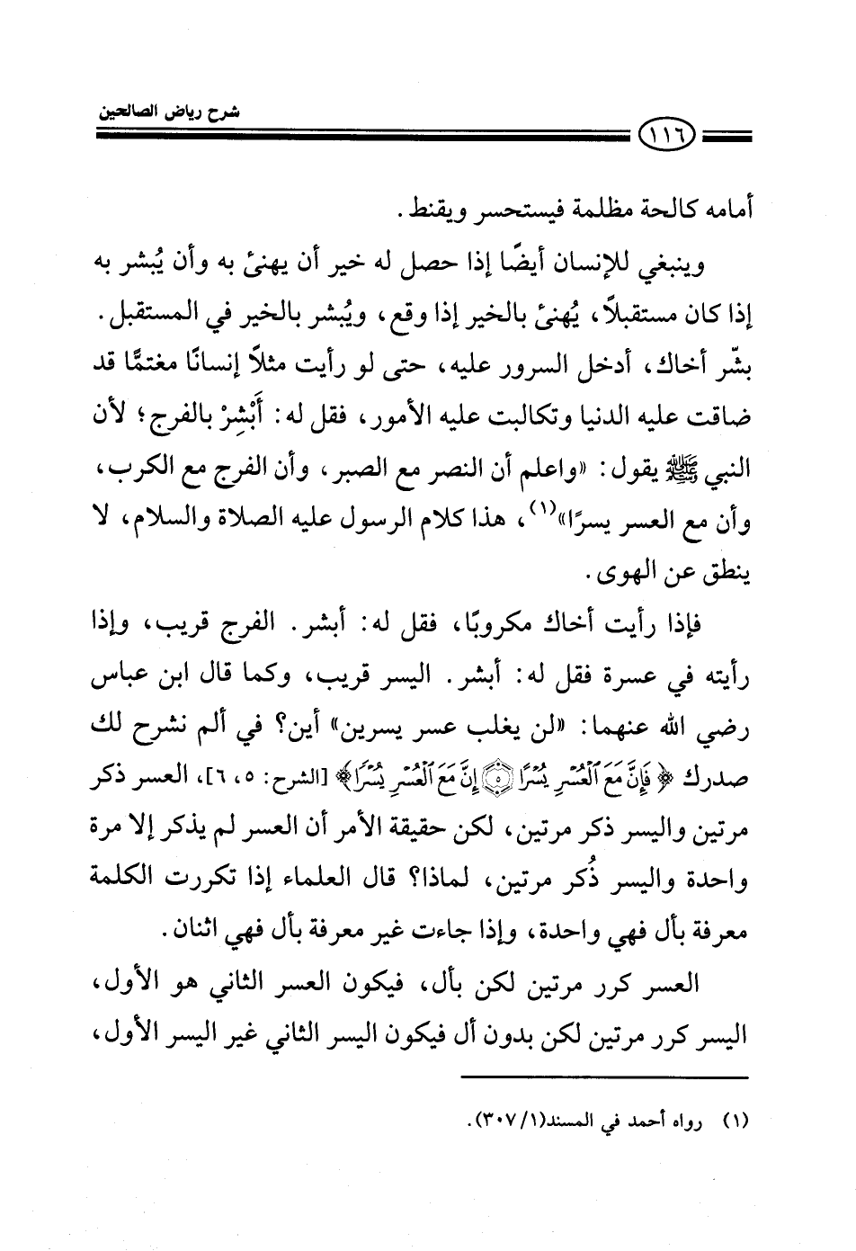 أمامه كالحة مظلمة فيستحسر ويقنط وينبغي للإنسان أيضا إذا حصل له خير أن يهنئ به وأن يبشر به إذا كان مستقبلا يهنئ به بالخير إذا وقع ويبشر بالخير في المستقبل بشر أخاك السرور عليه حتى لو رأيت مثلا إنسانا مغتما قد ضاقت عليه الدنيا وتكالبت عليه الأمور فقل له أبشر: بالفرج لأن النبي صلى الله عليه وسلم يقول واعلم أن النصر مع الصبر وأن الفرج مع الكرب وأن مع العسر يسر هذا كلام الرسول عليه الصلاة والسلام ما ينطق عن الهوى فإذا رأيت أخاك مكروبا فقل له أبشر فالفرج قريب وإذا رايته في عسر فقل له اليسر القريب وكما قال ابن عباس رضي الله عنهما: لن يغلب عسر يسرين في سورة ألم نشرح لك صدرك {فإن مع العسر يسرا إن مع العسر يسرا} العسر ذكر مرتين واليسر ذكر مرتين لكن حقيقة الأمر أن العسر لم يذكر إلا مرة واحدة واليسر ذكر مرتين لماذا؟ قال العلماء إذا تكررت الكلمة معرفة بأل فهي واحدة وإذا تكررت غير معرفة بأل فهي اثنان العسر كرر مرتين لكن بأل فيكون العسر الثاني هو الأول اليسر كرر مرتين لكن بدون أل فيكون اليسر الثاني غير اليسر الأول