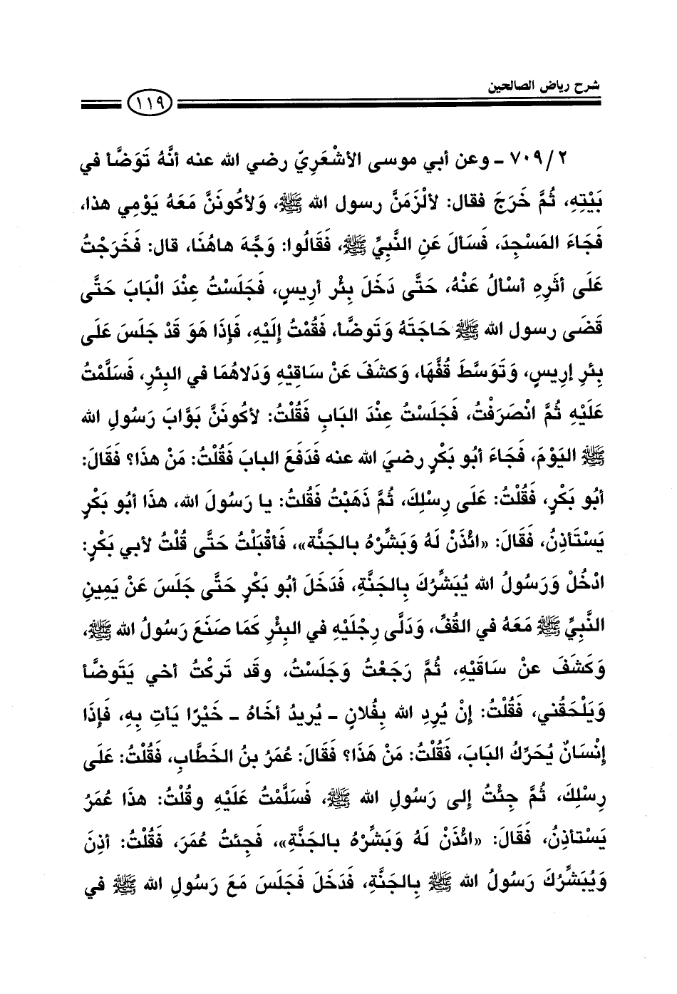 709 - وعن أبي موسى الشعري رضي الله عنه أنه توضأ في بيته ثم خرج فقال لألزمن رسول الله صلى الله عليه وسلم ولأكونن معه يومي هذا فجاء المسجد، فسأل عن النبي صلى الله عليه وسلم فقالوا وجه هاهنا قال فخرجت على آثره أسأل عنه حتى دخل بئر أريس فجلست عند الباب حتى قضى رسول الله صلى الله عليه وسلم حاجته وتوضأ فقمت إليه فإذا هو قد جلس على بئر أريس وتوسط قفها وكشف عن ساقه ودلاهما في البئر فسلمت عليه ثم انصرفت فجلست عند الباب فقلت لأكونن بواب رسول الله صلى الله عليه وسلم اليوم فجاء أبو بكر رضي الله عنه فدفع الباب فقلت من هذا؟ فقال: أبو بكر فقلت: على رسلك ثم ذهبت فقلت يا رسول الله هذا أبو بكر يستأذن فقال: ائذن له وبشره بالجنة فأقبلت حتى قلت لأبي بكر ادخل ورسول الله يبشرك بالجنة فدخل أبو بكر حتى جلس عن يمين النبي صلى الله عليه وسلم معه في القف ودلى رجليه في البئر كما صنع رسول الله صلى الله عليه وسلم وكشف عن ساقيه ثم رجعت وجلست وقد تركت أخي يتوضأ ويلحقني فقلت إن يرد بفلان يريد أخاه خيرا يأت به فإذا إنسان يحرك الباب فقلت: من هذا؟ فقال عمر بن الخطاب فقلت: على رسلك ثم جئت إلى رسول الله صلى الله عليه وسلم فسلمت عليه وقلت: هذا عمر يستأذن؟ فقال: ائذن له وبشره بالجنة فجئت عمر فقلت: أذن أدخل ويبشرك رسول الله صلى الله عليه وسلم بالجنة فدخل فجلس مع رسول الله صلى الله عليه وسلم في