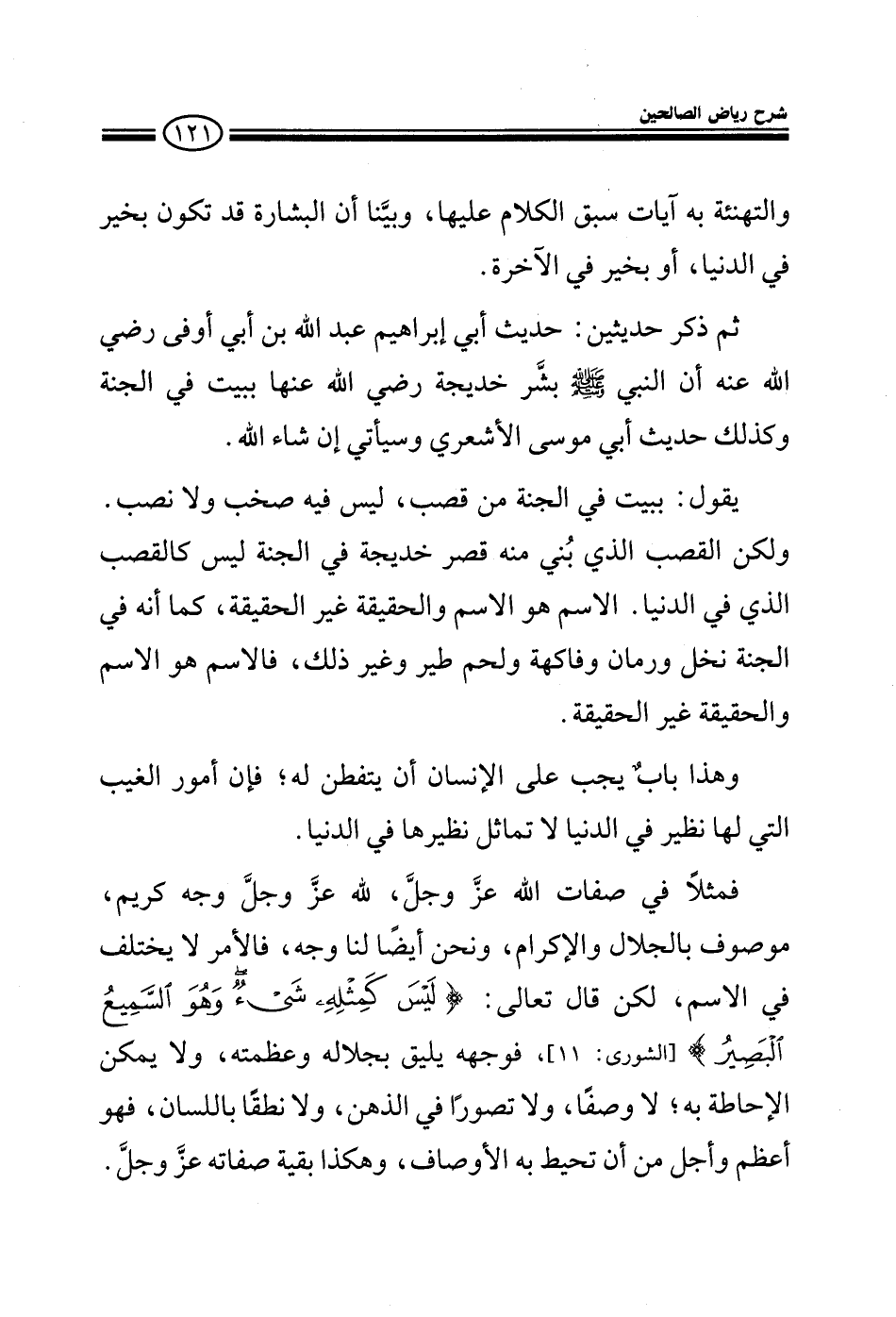 والتهنئة به آيات سبق الكلام عليها، وبينا أن البشارة قد تكون بخير في الدنيا وقد تكون في الآخرة ثم ذكر حديثين حديث أبي إبراهيم عبد الله بن أبي أوفي رضي الله عنه أن النبي صلى الله عليه وسلم بشر خديجة رضي الله عنها ببيت في الجنة وكذلك حديث أبي موسى الأشعري وسيأتي إن شاء الله فقد بشر صلى الله عليه وسلم خديجة رضي الله عنه ببيت في الجنة من قصب ليس فيه صخب ولا نصب ولكن القصب الذي بني منه قصر خديجة في الجنة ليس كالقصب الذي في الدنيا الاسم هو الاسم والحقيقة غير الحقيقة كما أنه في الجنة نخل ورمان وفاكهة ولحم طير وغير ذلك لكن التشابه في الاسم فقط فالاسم هة الاسم والحقيقة غير الحقيقة وهذا باب يجب على الإنسان أن يتفطن له فإن أمور الغيب التي لها نظير في الدنيا لا تماثل نظيرها في الآخرة فمثلا في صفات الله عز وجل، لله عز وجل وجه كريم، موصوف بالجلال والإكرام، ونحن أيضا لنا وجه، الأمر لا يختلف في الاسم لكن قال تعالى: ليس كمثله شيء وهو السميع البصير فوجهه يليق بجلاله وعظمته ولا يمكن الإحاطة به لا وصفا ولا تصورا في الذهن ولا نطفا باللسان فهو أعظم وأجل من أن تحيط به الأوصاف وهكذا بقية صفاته عز وجل
