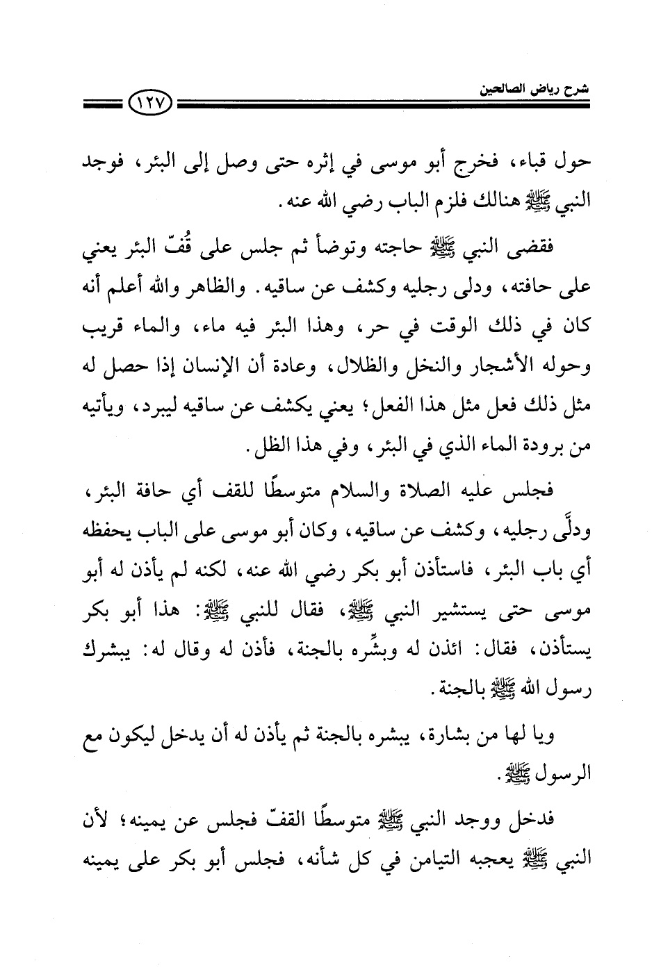 حول قباء فخرج أبو موسى في إثره حتى وصل إلى البئر فوجد النبي صلى الله عليه وسلم هنالك فلزم الباب رضي الله عنه فقضى النبي صلى الله عليه وسلم حاجته وتوضأ ثم جلس على قف البئر يعني على حافته ودلى رجليه وكشف عن ساقيه والظاهر والله أعلم أنه كان في ذلك الوقت في حر وهذا البئر فيه ماء والماء قريب وحوله الأشجار والنخل والظلال وعادة أن الإنسان إذا حصل له مثل ذلك فعل مثل هذا الفعل فيكشف عن ساقيه ليبرد جسمه وتأتيه من برودة الماء الذي في البئر وفي هذا الظل فجلس عليه الصلاة والسلام متوسطا للقف أي حافة البئر ودلى رجليه وكشف عن ساقيه وكان أبو موسى على الباب يحفظ باب البئر فاستأذن أبو بكر رضي الله عنه لكنه لم يأذن له أبو موسى حتى يستشير النبي صلى الله عليه وسلم فقال النبي صلى الله عليه وسلم هذا أبو بكر يستأذن فقال: ائذن له وبشره بالجنة فأذن له وقال له يبشرك رسول الله صلى الله عليه وسلم بالجنة ويا لها من بشارة يبشره بالجنة ثم يأذن له أن يدخل ليكون مع الرسول صلى الله عليه وسلم فدخل ووجد النبي صلى الله عليه وسلم متوسطا القف فجلس عن يمينه لأن النبي صلى الله عليه وسلم يعجبه التيامن في كل شيء فجلس أبو بكر عن يمينه