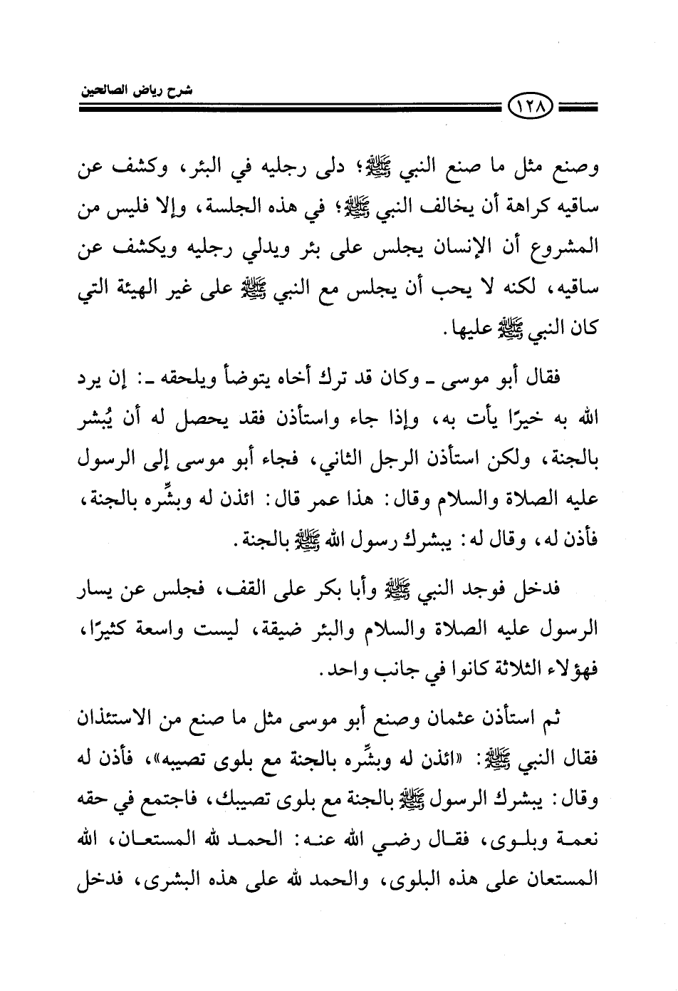 وضع مثل فعل النبي صلى الله عليه وسلم دلى رجليه في البئر وكشف عن ساقيه كراهة أن يخالف النبي صلى الله عليه وسلم في هذه الجلسة وإلا فليس من المشروع أن يجلس الإنسان على بئر ويدلي رجليه ويكشف عن ساقيه لكنه لا يجب أن يجلس مع النبي صلى الله عليه وسلم على غير الهيئة التي كان النبي صلى الله عليه وسلم يجلس عليها فقال أبو موسى وكان قد ترك أخاه يتوضأ ويلحقه إن يرد الله به خيرا يأت به وإذا جاءا واستأذن فقد حصل له أن يبشر بالحنة ولكن استأذن الرجل الثاني فجاء أبو موسى إلى الرسول عليه الصلاة والسلام وقال هذا عمر قال: ائذن له وبشره بالجنة فأذن له وقال له يبشرك رسول الله صلى الله عليه وسلم بالجنة فدخل فوجد النبي صلى الله عليه وسلم وأبا بكر على القف فجلس عن يسار الرسول عليه الصلاة والسلام والبئر ضيقة ليست واسعة كثرا فهؤلاء الثلاثة كانوا في جانب واحد ثم استأذن عثمان وصنع أبو موسى مثل ما صنع من الاستئذان فقال النبي صلى الله عليه وسلم ائذن له وبشره بالجنة مع بلوى تصيبه فأذن له وقال يبشرك الرسول صلى الله عليه وسلم بالجنة مع بلوى تصيبك فاجتمع في حقه نعمة وبلوى فدخل