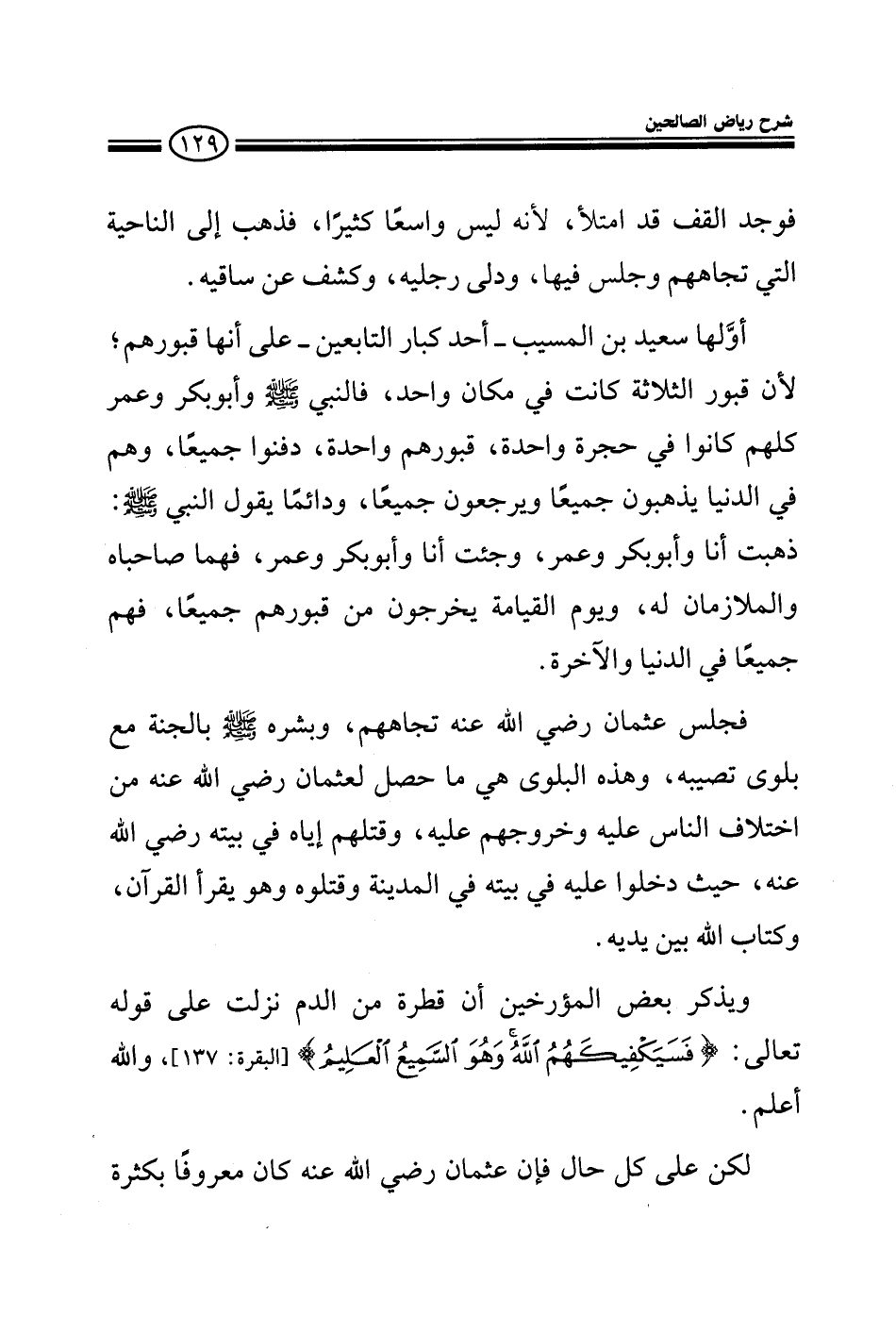 فوجد القف قد امتلأ لأنه ليس واسعا كثيرا فذهب إلى الناحية الأخرى تجاههم وجلس فيها ودلى رجليه وكشف عن ساقيه أولها سعيد بن المسيب أحد كبار التابعين على أنها قبور هؤلاء لأن قبور الثلاثة كانت في مكان واحد فالنبي صلى الله عليه وسلم أبو بكر وعمر كلهم كانوا في حجرة واحدة دفنوا جميعا في مكان واحد وكانوا في الدنيا يذهبون جميعا ويرجعون جميعا ودائما يقول النبي صلى الله عليه وسلم ذهبت أنا وأبو بكر وعمر وجئت أنا وأبو بكر وعمر فهما صاحباه ووزيراه ويم القيامة يخرجون من قبورهم جميعا فجلس عثمان رضي الله عنه تجاههم وبشره صلى الله عليه وسلم بالجنة مع بلوى تصيبه وهذه البلوى هي ما حصل له رضي الله عنه من اختلاف الناس عليه وخروجهم عليه وقتلهم إياه في بيته رضي الله عنه حيث دخلوا عليه في بيته وقتلوه وهو يقرا القرآن وكتاب الله بين يديه ويذكر بعد المؤرخين أن قطرة من الدم نزلت على قوله تعالى {فسيكفيكهم الله وهو السميع العليم} والله أعلم لكن على كل حال هو رضي الله عنه كان معروفا بكثرة