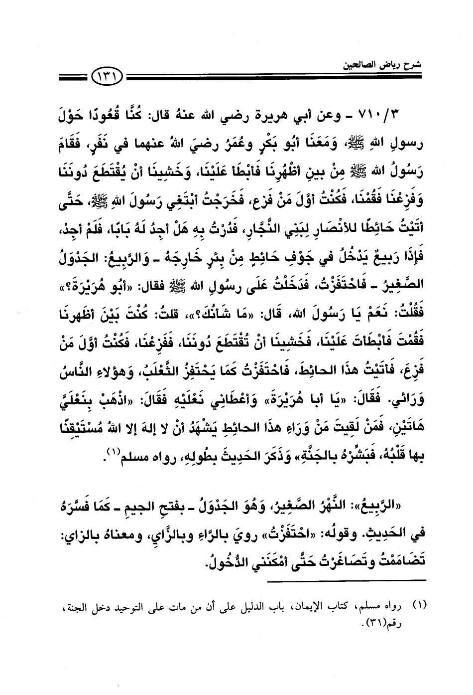 710 - وعن أبي هريرة رضي الله عنه قال: كنا قعودا حول رسول الله صلى الله عليه وسلم ومعنا أبو بكر وعمر رضي الله عنه في نفر فقام رسول الله صلى الله عليه وسلم من بين أظهرنا فأبطأ علينا وخشينا أن يقتطع دوننا وفزعنا فقمنا فكنت أول من فزع فخرجت أبتغي رسول الله صلى الله عليه وسلم حتى أتيت حائطا للأنصار لبني النجار فدرت به هل أجد له بابا فلم أجد فإذا ربيع يدخل في جوف حائط من بئر خارجه والربيع الجدول الصغير فاحتفرت فدخلت على رسول الله صلى الله عليه وسلم فقال: أبو هريرة؟ فقلت نعم يا رسول الله قال ما شأنك قلت كنت بين أظهرنا فقمت فأبطأت علينا فخشينا أن تقتطع دوننا ففزعنا فكنت أول من فزع فأتيت هذا الحائط فاحتفرت كما يحتفر الثعلب وهؤلاء الناس ورائي قال: يا أبا هريرة وأعطاني نعليه فقال اذهب بنعلي هاتين فمن لقيت من وراء هذا الحائط يشهد أن لا إله إلا الله مستيقنا بها قلبه فبشره بالجنة وذكر الحديث بطوله رواه مسلم الربيع النهر الصغير وهو الجدول بفتح الجيم كما فسره في الحديث وقوله: احتفزت روى بالراء وبالزاي ومعناه بالزاي تضامنت وتصاغرت حتى أمكنني الدخول