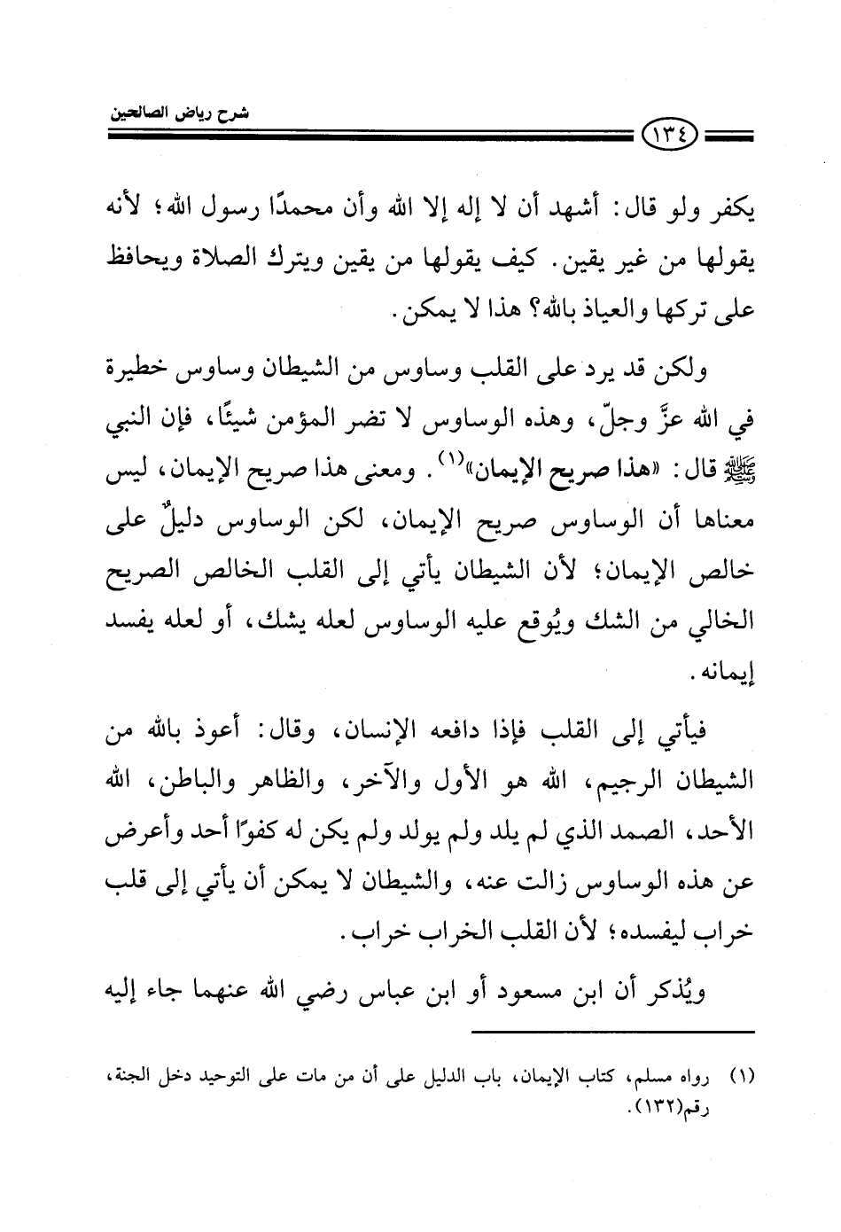 يكفر ولو قال: أشهد أن لا إله إلا الله وأن محمدا رسول الله، لأنه يقولها من غير يقين: إذ كيف يقولها من يقين ويترك الصلاة ويحافظ على تركها والعياذ بالله؟ ولكن قد يرد على القلب وساوس من الشيطان في الله عز وجل وهذه الوساوس لا تضر المؤمن شيئا فإن النبي صلى الله عليه وسلم قال: هذا صريح الإيمان ليس معنى ذلك أن الوساوس نفسها صريح الإيمان لكن الوساوس دليل على خالص الإيمان لأن الشيطان يأتي إلى القلب الخالص الصريح الخالي من الشك ويوقع عليه الوساوس لعله يشك أو لعله يفسد إيمانه فيأتي الشيطان إلى القلب العامر بالإيمان فإذا دافعه الإنسان وقال أعوذ بالله من الشيطان الرجيم وأخذ الله عز وجل ويمجده وأعرض عن هذا الوساوس زالت عنه والشيطان لا يأتي إلى قلب خراب ليفسده لأن القلب الخراب خراب ويذكر أن ابن مسعود أو ابن عباس رضي الله عنهما جاء إليه