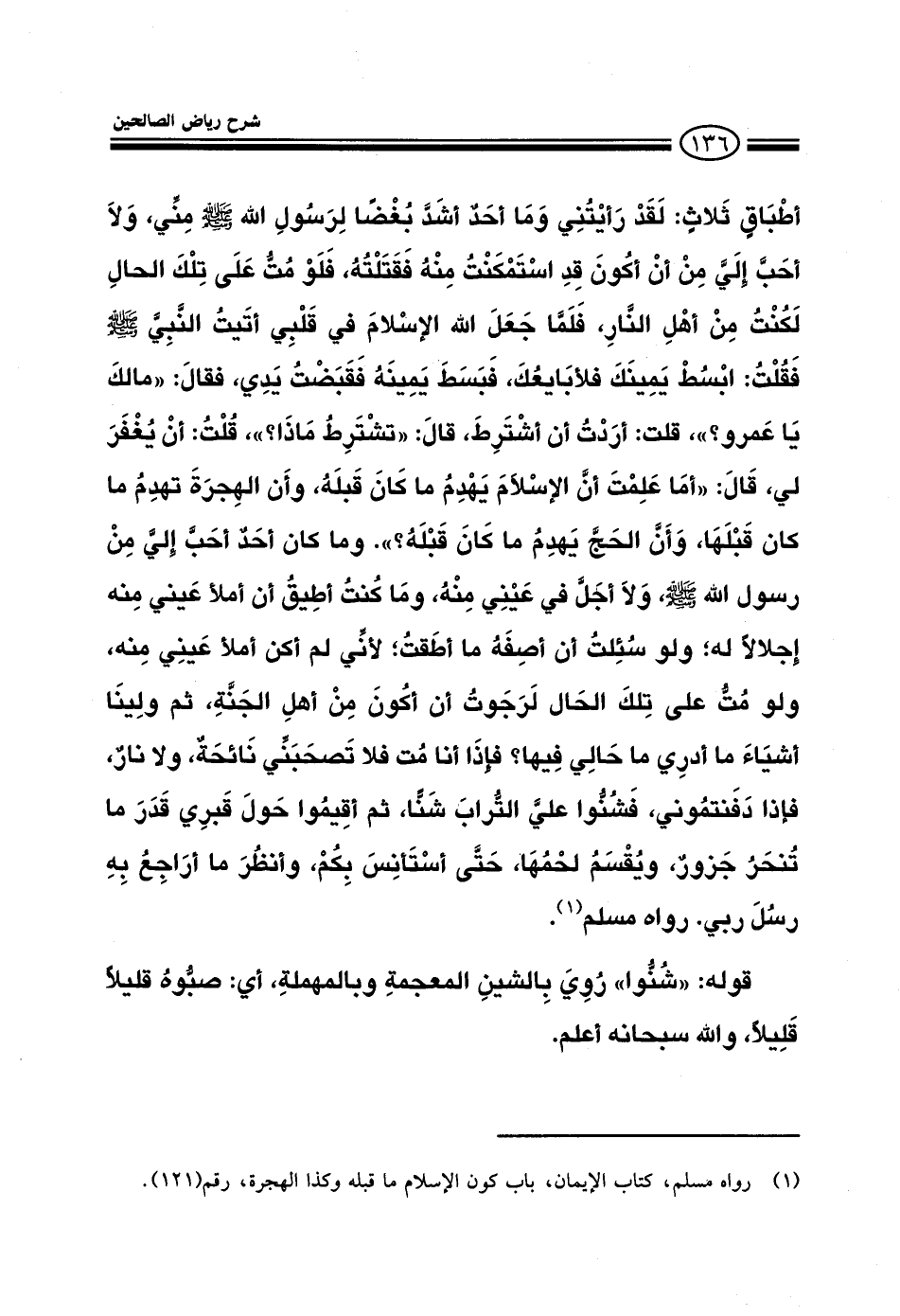 أطباق ثلاث لقد رأيتني وما أحد أشد بغضا لرسول الله صلى الله عليه وسلم مني ولا أحب إلي من أن أكون قد استمكنت منه فقتله فلو مت على تلك الحال لكنت من أهل النار فلما جعل الله الإسلام في قلبي أتيت النبي صلى الله عليه وسلم فقلت ابسط يمينك فلأبايعك فبسط يمينه فقبضت يدي فقال مالك يا عمرو؟ قلت: أردت أن أشترط قال: تشترط ماذا؟ قلت أن يغفر لي قال: أما علمت أن الإسلام يهدم ما كان قبله وأن الهجرة تهدم ما كان قبلها وأن الحج يهدم ما كان قبله؟ وما كان أحد أحب إلى من رسول الله صلى الله عليه وسلم ولا أجل في عيني منه وما كنت أطيق أن املأ عيني منه إجلالا به ولو سئلت أن أصفه ما أطقت لأني لم أكن أملأ عيني منه ولو مت على تلك الحال لرجوت أن أكون من أهل الجنة ثم ولينا أشياء ما أدري ما حالي فيها؟ فإذا أنا مت فلا تصحبني نائحة ولا نار فإذا دفنتموني فشنوا علي التراب شنا ثم أقيموا حول قبري قدر ما تنحر جزور ويقسم لحمها حتى أستأنس بكم وأنظر ما أرجع به رسل ربي رواه مسلم قوله: شنوا روي بالشين المعجمة وبالمهملة أي: صبوة قليلا قليلا والله سبحانه أعلم