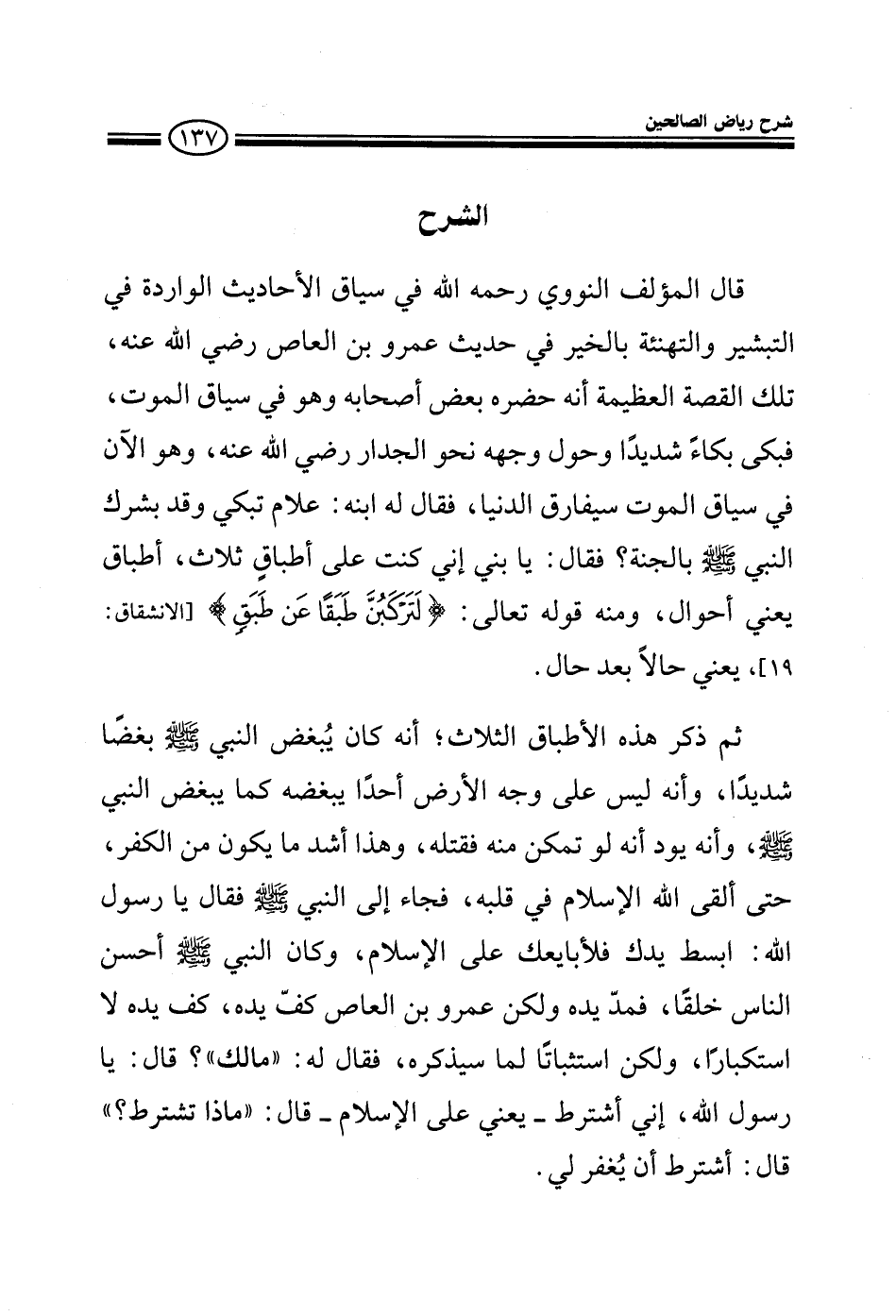 EXثم ذكر المؤلف رحمه الله في سياق الأحاديث الواردة في التبشير والتهنئة بالخير حديث عمرو بن العاص رضي الله عنه تلك القصة العظيمة أنه حضره بعض أصحابه وهو في سياق الموت فبكى بكاء شديدا وحول وجهه نحو الجدار رضي الله عنه وهو في سياق الموت سيفارق الدنيا فقال له ابنه: علام تبكى وقد بشرك النبي صلى الله عليه وسلم بالجنة؟ فقال: يا بني إني كنت على أطباق ثلاث، أطباق يعني أحوال ومنه قوله تعالى: لتركبن طبقا عن طبق يعني حالا بعد حال ثم ذكر هذه الأطباق الثلاث أنه كان يبغض النبي صلى الله عليه وسلم بغضا شديدا وأنه لم يكن على وجه الأرض أحد يبغضه كما كان يبغضه هو وأنه يود أنه لو تمكن منه فقتله وهذا أشد ما يكون من الكفر حتى ألقى الله الإسلام في قلبه فجاء إلى النبي صلى الله عليه وسلم فقال يا رسول الله: ابسط يدك فلأبايعك على الإسلام وكان النبي صلى الله عليه وسلم أحسن الناس خلقا فمد يده ولكن عمرو بن العاص كف يده، ليس استكبارا ولكن استثباتا لما سيذكره فقال له: مالك قال: يا رسول الله إني أشترط يعني على الإسلام قال: ماذا تشترط أن يغفر لي