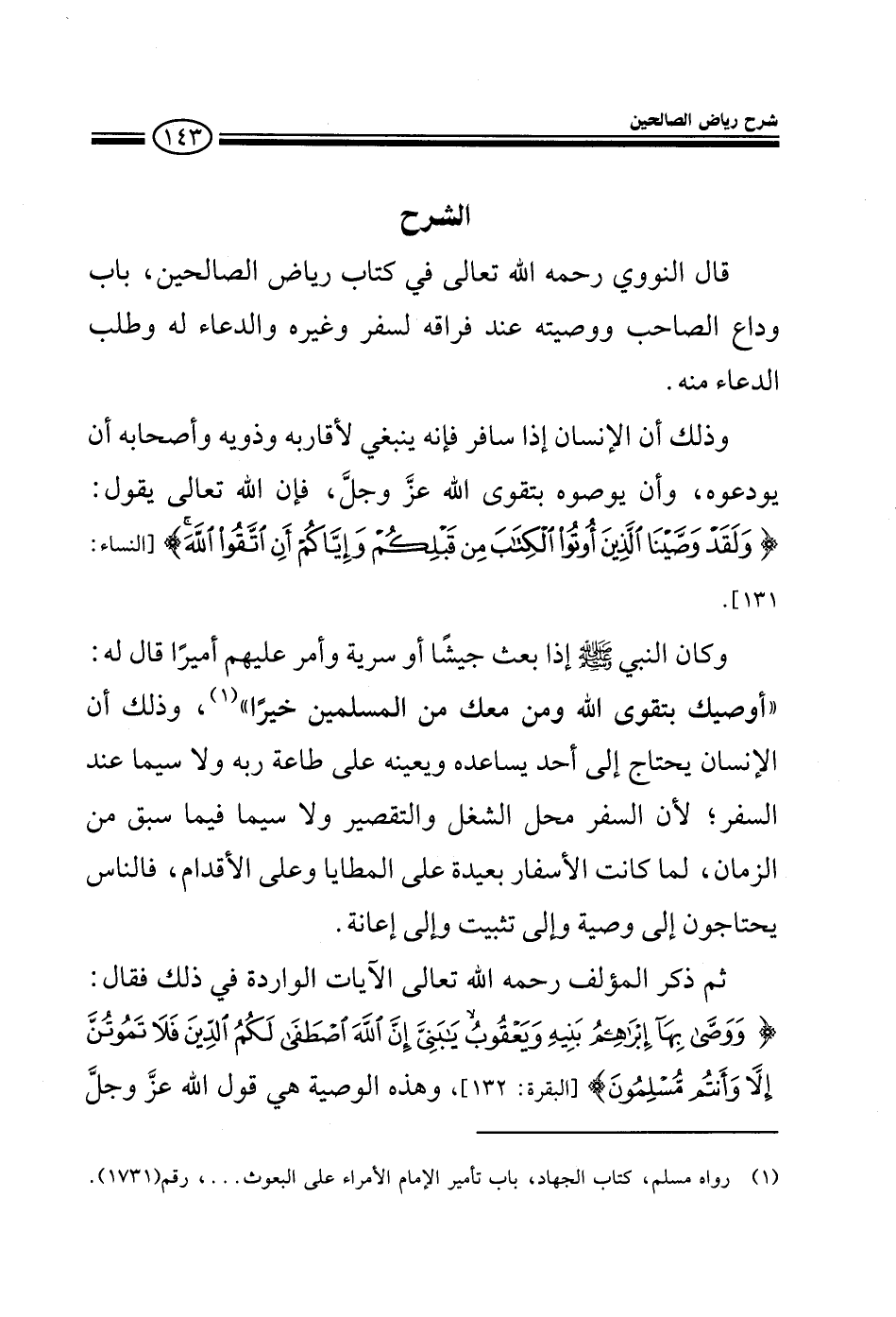 EXقال النووي رحمه الله تعالى: (باب وداع الصاحب ووصيته عند فراقه لسفر وغيره والدعاء له وطلب الدعاء منه) وذلك أن الإنسان إذا سافر فينبغي لذويه وأقاربه وأصحابه أن يودعوه وأن يوصوه بتقوى الله عز وجل فإن الله تعالى يقول: وَلَقَدْ وَصَّيْنَا الَّذِينَ أُوتُوا الْكِتَابَ مِن قَبْلِكُمْ وَإِيَّاكُمْ أَنِ اتَّقُوا اللهَ وكان النبي صلى الله عليه وسلم إذا بعث جيشا أو سرية وأمر عليهم أميرا قال له: أوصيك بتقوى الله ومن معك من المسلمين خيرا وذلك أن الإنسان يحتاج إلى من يساعده ويعينه على طاعة ربه لا سيما عند السفر لأن السفر محل الشغل والتقصير لاسيما فيما سبق من الزمان لما كانت الأسفار بعيدة على المطايا وعلى الأقدام فالناس يحتاجون إلى وصية وإلى تثبيت وإلى إعانة ثم ذكر المؤلف رحمه الله تعالى الآيات الواردة في ذلك فذكر قوله تعالى: {وَوَصَّى بِهَا إِبْرَاهِيمُ بَنِيهِ وَيَعْقُوبُ يَا بَنِيَّ إِنَّ اللهَ اصْطَفَى لَكُمُ الدِّينَ فَلاَ تَمُوتُنَّ إِلاَّ وَأَنْتُم مُّسْلِمُونَ} وهذه الوصية هو قول الله عز وجل