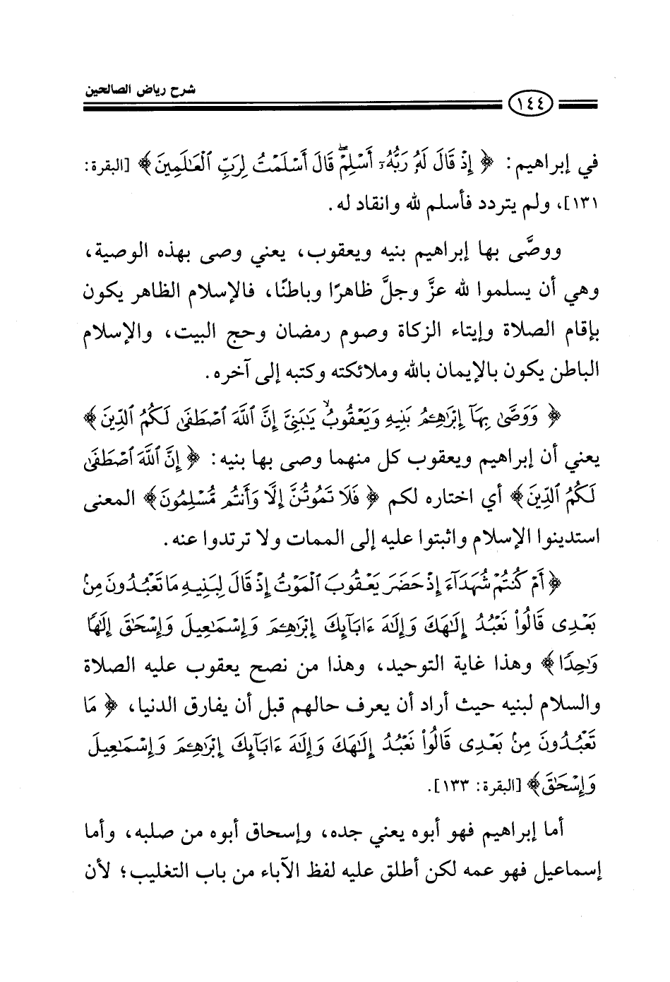 في إبراهيم: {إذ قال له ربه أسلم قال أسلمت لرب العالمين} ولم يتردد فاسلم لله وانقاد له {ووصى بها إبراهيم بنيه ويعقوب} يعني: وصى بهذه الوصية وهي أن يسلموا لله عز وجل ظاهرا وباطنا فلإسلام الظاهر يكون بإقام الصلاة وإيتاء الزكاة وصوم رمضان وحج البيت والإسلام الباطن يكون بالإيمان بالله وملائكته وكتبه إلى آخره {ووصى بها إبراهيم بنيه ويعقوب} يعني أن إبراهيم ويعقوب كلا منهما وصى بها بنيه قائلا: {إن الله اصطفى لكم الدين} أي اختاره لكم {فلا تموتن إلا وأنتم مسلمون} المعنى استدينوا الإسلام واثبتوا عليه إلى الممات ولا ترتدوا عنه {أَمْ كُنْتُمْ شُهَدَاءَ إِذْ حَضَرَ يَعْقُوبَ الْمَوْتُ إِذْ قَالَ لِبَنِيهِ مَا تَعْبُدُونَ مِن بَعْدِي قَالُوا نَعْبُدُ إِلَهَكَ وَإِلَهَ آبَائِكَ إِبْرَاهِيمَ وَإِسْمَاعِيلَ وَإِسْحَاقَ إِلَهًا وَاحِدًا} وهذا غاية التوحيد وهو من نصح يعقوب عليه السلام لبنيه حيث أراد أن يعرف حالهم قبل أن يفارق الدنيا {مَا تَعْبُدُونَ مِن بَعْدِي قَالُوا نَعْبُدُ إِلَهَكَ وَإِلَهَ آبَائِكَ إِبْرَاهِيمَ وَإِسْمَاعِيلَ وَإِسْحَاقَ} أما إبراهيم فهو أبوه يعني جده وإسحاق أبوه من صلبة وأما إسماعيل فهو عمه لكن أطلق عليه لفظ الآباء من باب التغليب لأن