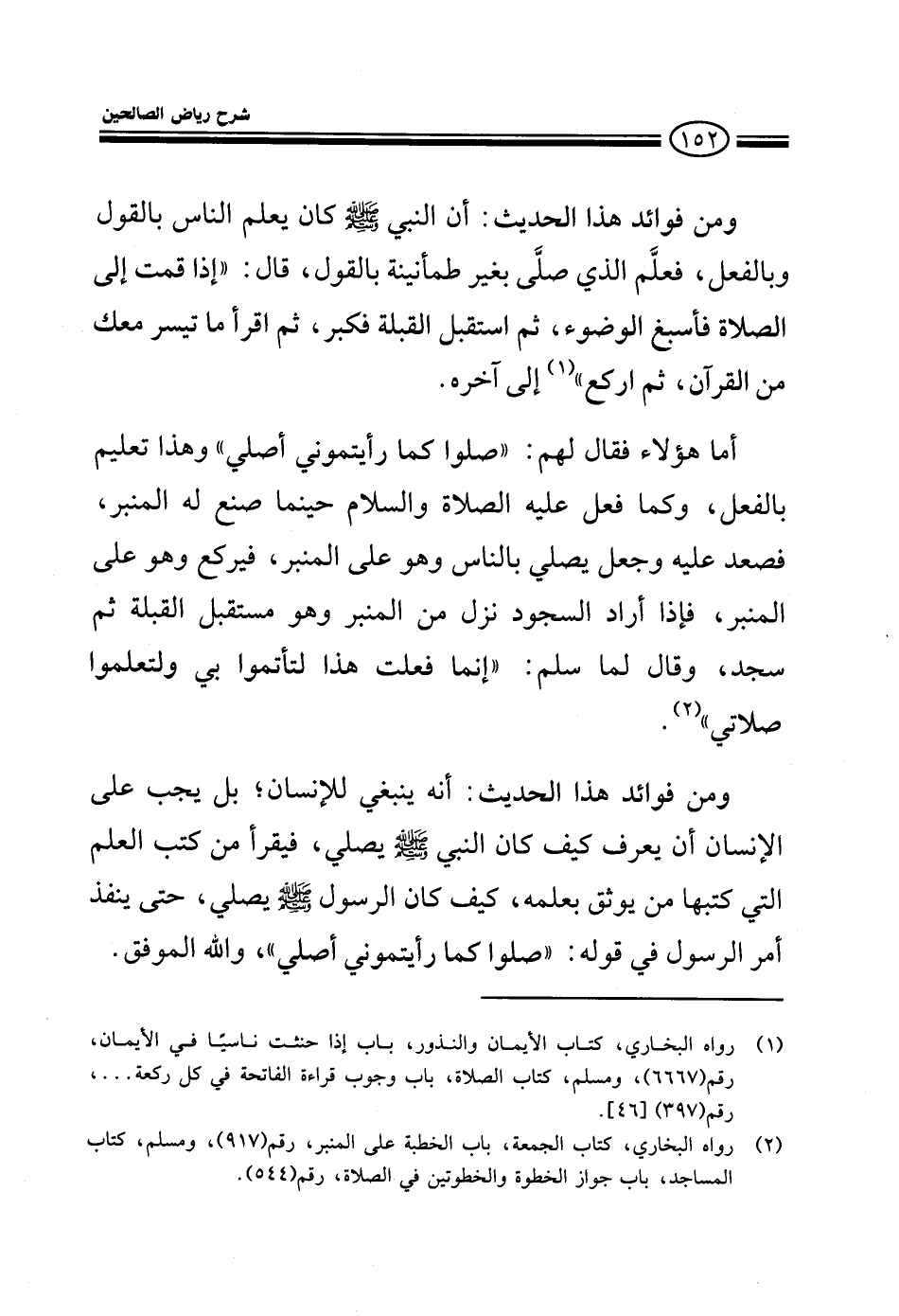 ومن فوائد هذا الحديث: أن النبي صلى الله عليه وسلم كان يعلم الناس بالقول وبالفعل فعلم الذي صلى بغير طمأنينة بالقول قال: إذا قمت إلى الصلاة فأسبغ الوضوء ثم استقبل القبلة فكبر ثم اقرأ ما تيسر معك من القرآن ثم اركع إلى آخره أما هؤلاء فقال لهم: صلوا كما رأيتموني أصلي وهذا تعليم بالفعل وكما فعل عليه الصلاة والسلام حينما صنع له المنبر فصعد عليه وجعل يصلي بالناس وهو على المنبر فيركع وهو على المنبر فإذا أراد السجود نزل من المنبر وهو مستقبل القبلة ثم سجد وقال لما سلم: إنما فعلت هذا لتأتموا بي ولتعلموا صلاتي ومن فوائد هذا الحديث: أنه على الإنسان أن يعرف كيف كان النبي صلى الله عليه وسلم يصلي فيقرأ من كتب العلم التي كتبها من يوثق في عمله كيف كان الرسول صلى الله عليه وسلم يصلي حتى ينفذ أمر الرسول في قوله: صلوا كما رأيتموني أصلي