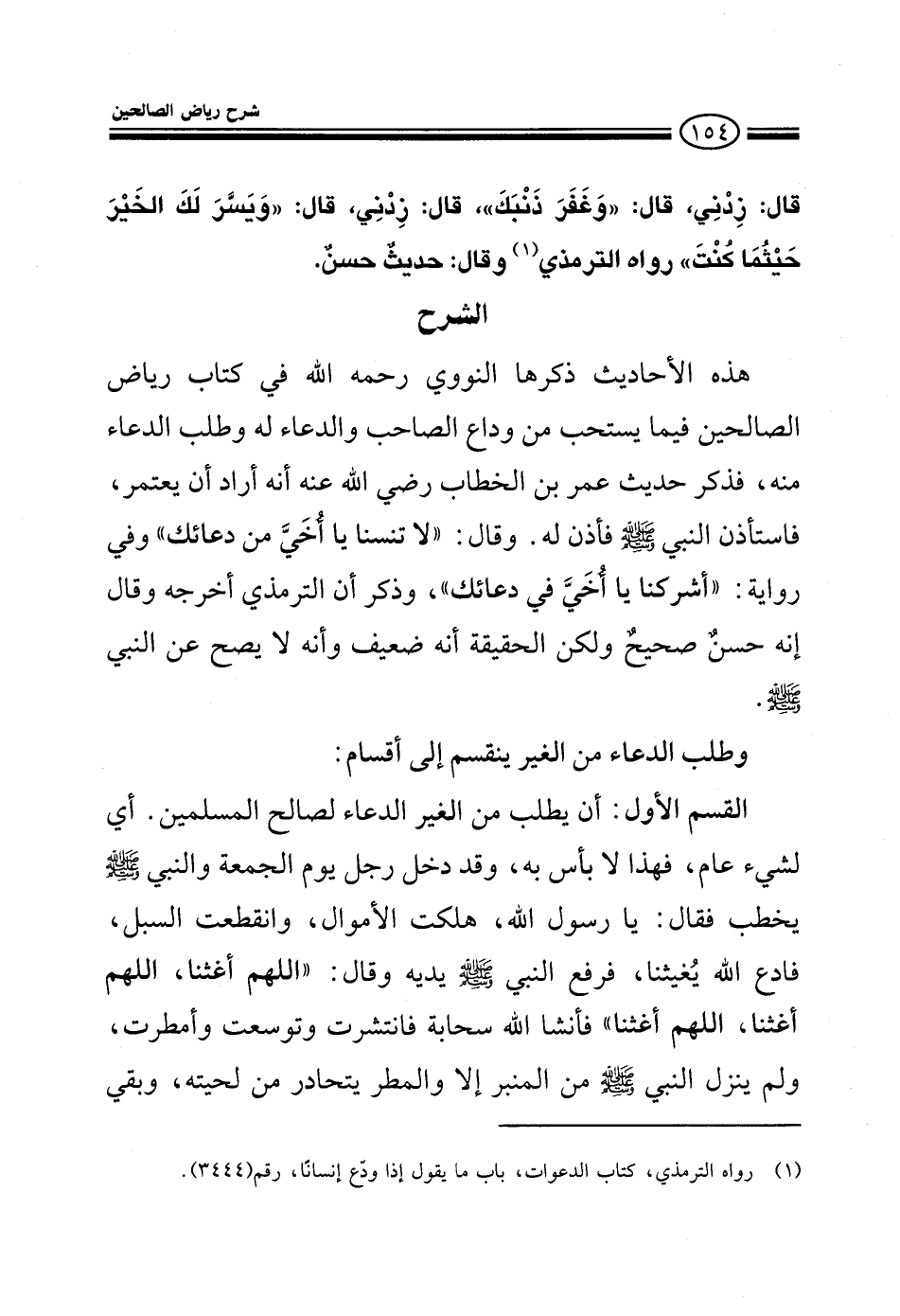 وقال: لا تنسنا يا أخي من دعائك وفي رواية: أشركنا يا أخي في دعائك وذكر أن الترمذي أخرجه وقال إنه حسن صحيح ولكن الحقيقة أنه ضعيف وأنه لا يصح عن النبي صلى الله عليه وسلم وطلب الدعاء من الغير ينقسم إلى أقسام: القسم الأول: أن يطلب من الغير الدعاء لصالح المسلمين جميعا أي شيء عام فهذا لا بأس به، وقد دخل رجل يوم الجمعة والنبي صلى الله عليه وسلم يخطب فقال: يا رسول الله هلكت الأموال وانقطعت السبل فادع الله يغيثنا فرفع النبي صلى الله عليه وسلم يديه وقال: اللهم أغثنا اللهم أغثنا اللهم أغثنا فأنشأ الله سحابة فانتشرت وتوسعت وأمطرت ولم ينزل النبي صلى الله عليه وسلم من المنبر إلا والمطر يتحادر من لحيته، وبقي
