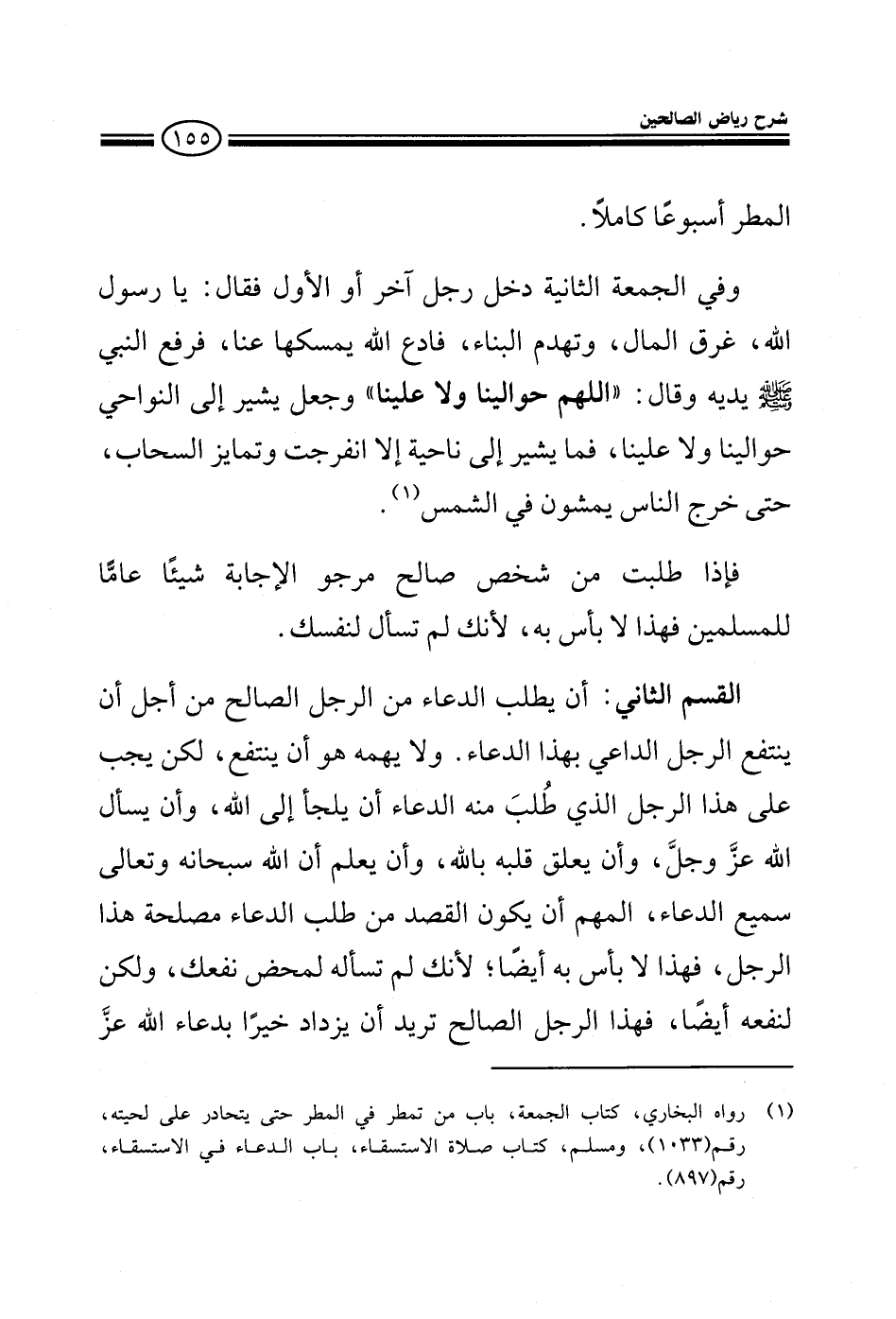 المطر أسبوعا كاملا وفي الجمعة الثانية دخل رجل آخر أو الأول فقال: يا رسول الله غرق المال وتهدم البناء فادع الله يمسكها عنا فرفع النبي صلى الله عليه وسلم يديه وقال: اللهم حوالينا ولا علينا وجعل يشير إلى النواحي فما يشير إلى ناحية إلا انفرجت وتمايز السحاب حتى خرج الناس يمشون في الشمس فإذا طلبت من شخص صالح مرجو الإجابة شيئا عاما للمسلمين فهذا لا بأس به لأنك لم تسأل لنفسك مثال ذلك: لو أن رجلا جاء إليك يطلب منك الشفاعة لتغيث رجلا ملهوفا أو تقضى عنه دينه أو ترفع الظلم عن رجل ضعيف من المسلمين فإن هذا لا بأس به لأن المصلحة لغيره القسم الثاني: أن يطلب الدعاء من الرجل الصالح من أجل أن ينتفع الرجل بهذا الدعاء ولا يهمه هو أن ينتفع لكن يحب من هذا الرجل الذي طلب منه الدعاء أن يلجأ إلى الله وان يسأل الله عز وجل وأن يعلق قلبه بالله وأن يعلم أن الله سبحانه وتعالى سميع الدعاء المهم أن يكون قصده مصلحة هذا الرجل فهذا لا بأس به أيضا لأنك لم تسأله لمحض نفعك ولكن لنفعه هو فأنت تريد أن يزداد هذا الرجل الصالح خيرا بدعاء الله عز