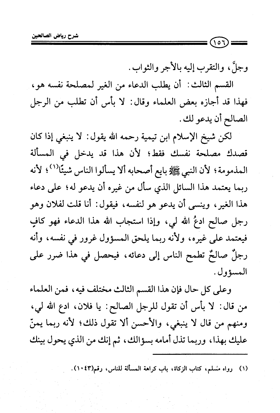 وجل وأن يتقرب إلى الله بالدعاء وأن يحصل على الأجر والثواب القسم الثالث: أن يطلب الدعاء من الغير لمصلحة نفسه هو فهذا أجازه بعض العلماء وقال لا بأس أن تطلب من الرجل الصالح أن يدعو لك لكن شيخ الإسلام ابن تيمية رحمه الله قال لا ينبغي إذا كان قصدك مصلحة نفسك فقط لأن هذا قد يدخل في المسألة المذمومة لأن النبي صلى الله عليه وسلم بايع أصحابه ألا يسألوا الناس شيئا وكذلك لأنه ربما يعتمد هذا السائل الذي سأل غيره أن يدعو له ربما يعتمد على دعاء هذا الغير وينسى أن يدعو هو لنفسه فيقول: أنا قلت لفلان وهو رجل صالح ادع الله لي وإذا استجاب الله هذا الدعاء فهو كاف فيعتمد على غيره وكذلك لأنه ربما يلحق المسئول غرور في نفسه وأنه رجل صالح يطمع الناس إلى دعائه فيحصل في هذا شر على المسئول وعلى كل حال فإن هذا القسم الثالث مختلف فيه فمن العلماء من قال: لا بأس أن تقول للرجل الصالح يا فلان ادع الله لي ومنهم من قال لا ينبغي والأحسن ألا تقول ذلك لأنه ربما يمن عليك بهذا وربما تذل أمامه بسؤالك ثم إنه من الذي يحول بينك