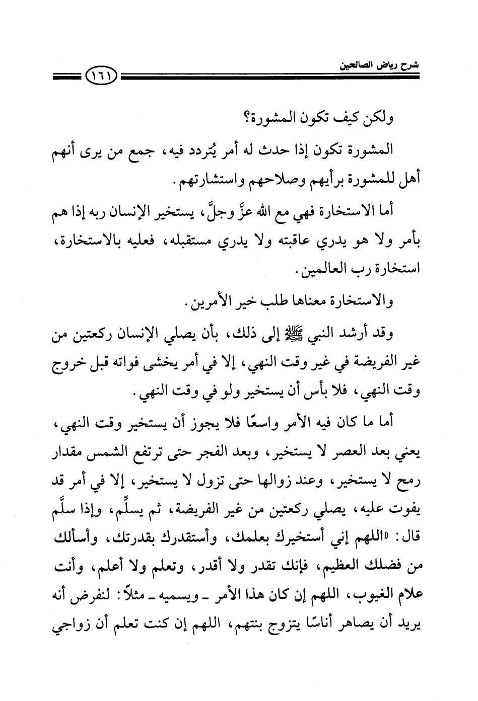 ولكن كيف تكون المشورة المشورة تكون إذا حدث له أمر يتردد فيه جمع الإمام من يرى أنهم أهل للمشورة برأيهم وصلاحهم واستشارهم أما الاستخارة فهي مع الله عز وجل يستخير الإنسان ربه إذا هم بأمر وهو لا يدري عاقبته ولا يدري مستقبله فعليه بالاستخارة والاستخارة معناها طلب خير الأمرين وقد أرشد النبي صلى الله عليه وسلم إلى ذلك بأن يصلي الإنسان ركعتين من غير الفريضة في غير وقت النهي إلا في أمر يخشى فواته قبل خروج وقت النهي فلا بأس أن يستخير ولو في وقت النهي أما ما كان فيه الأمر واسعا فلا يجوز أن يستخير وقت النهي فلا يستخير بعد صلاة العصر وكذلك بعد الفجر حتى ترتفع الشمس مقدار رمح وكذلك عند زوالها حتى تزول لا يستخير إلا في أمر قد يفوت عليه يصلي ركعتين من غير الفريضة ثم يسلم وإذا سلم قال: اللهم إني أستخيرك بعلمك وأستقدرك بقدرتك وأسألك من فضلك العظيم فإنك تقدر ولا أقدر وتعلم ولا أعلم وأنت علام الغيوب اللهم إن كان هذا الأمر ويسميه