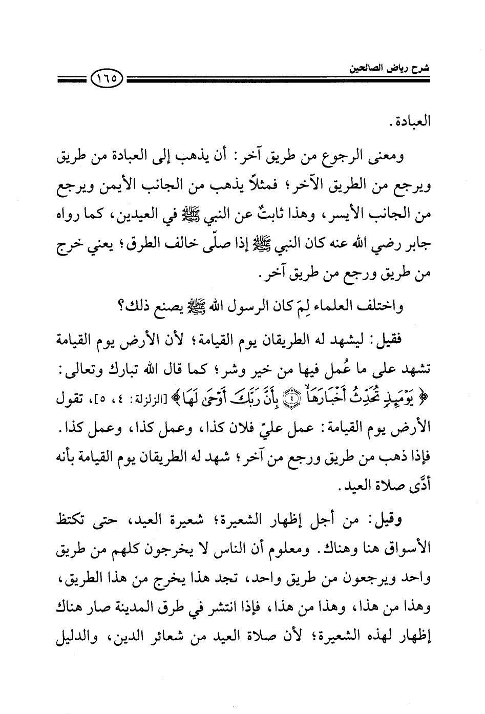 ومعنى مخالفة الطريق: أن يذهب إلى العبادة من طريق ويرجع من الطريق الآخر فمثلا يذهب من الجانب الأيمن ويرجع من الجانب الأيسر وهذا ثابت عن النبي صلى الله عليه وسلم في العيدين كما رواه جابر رضي الله عنه كان النبي صلى الله عليه وسلم إذا كان يوم عيد خالف الطريق يعني خرج من طريق ورجع من طريق آخر واختلف العلماء لم كان رسول الله صلى الله عليه وسلم يصنع ذلك؟ فقيل: ليشهد له الطريقان يوم القيامة لأن الأرض يوم القيامة تشهد على ما عمل فيها من خير وشر كما قال الله تبارك وتعالى: يومئذ تحدث أخبارها بأن ربك أوحى لها تشهد الأرض فتقول عمل على فلان كذا وعمل على فلان كذا فإذا ذهب من طريق ورجع من آخر شهد له الطريقان يوم القيامة بأنه أدى صلاة العيد وقيل من أجل إظهار الشعيرة شعيرة العيد حتى تكتظ الأسواق هنا وهناك ومعلوم أن الناس لا يخرجون كلهم من طريق واحد ويرجعون من طريق واحد تجد هذا يخرج من هذا الطريق وهذا من هذا هذا من هذا فإذا انتشر الناس في طرق المدينة صار في هذا إظهار لهذه الشعيرة لأن صلاة العيد من شعائر الدين والدليل