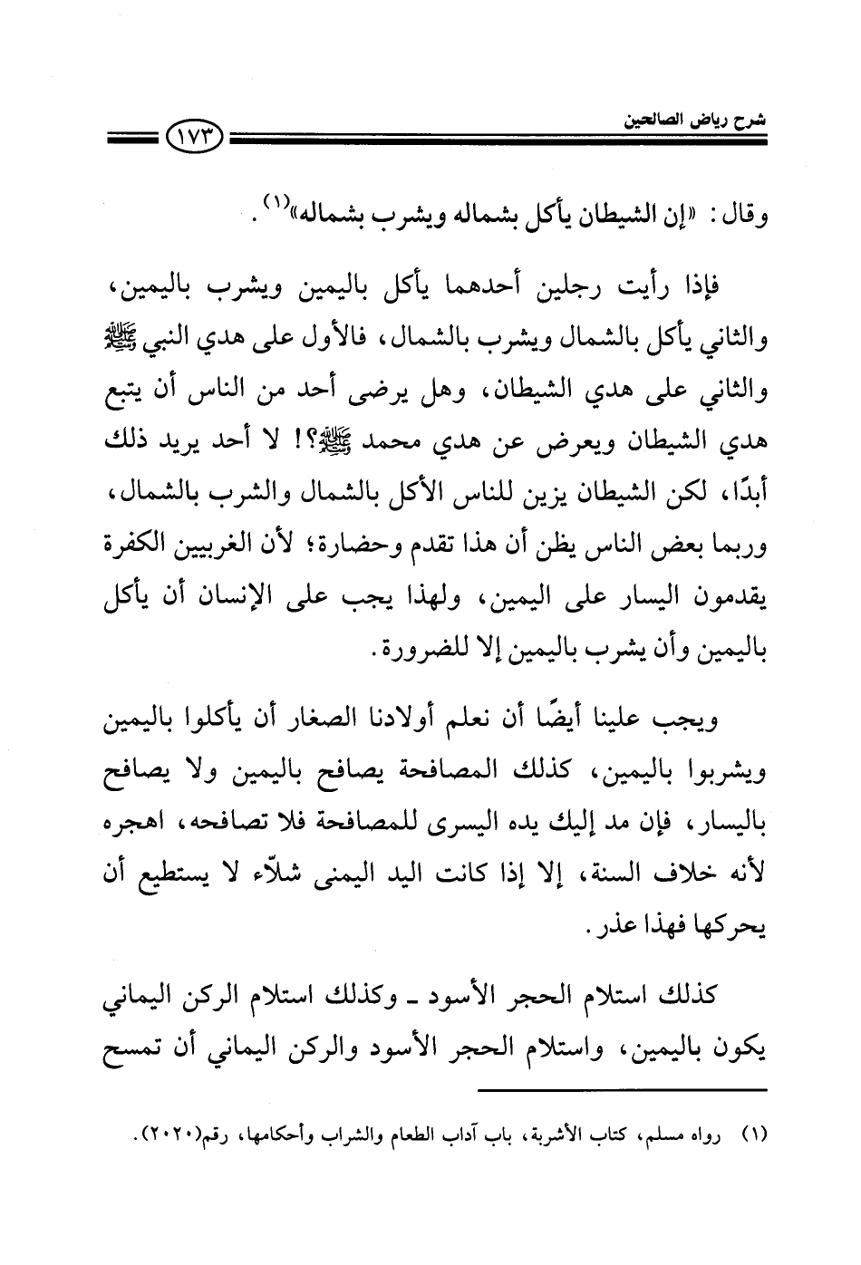 وقال: إن الشيطان يأكل بشماله ويشرب بشماله فإذا رأيت رجلين أحدهما يأكل باليمين ويشرب باليمين والثاني يأكل بالشمال ويشرب بالشمال فالأول على هدى النبي صلى الله عليه وسلم والثاني على هدى الشيطان وهل يرضى أحد من الناس أن يتبع هدى الشيطان ويعرض عن هدى محمد صلى الله عليه وسلم لا أحد يريد ذلك أبدا لكن الشيطان يزين للناس الأكل بالشمال والشرب بالشمال وربما بعض الناس يظن أن هذا تقدم وحضارة لأن الغربيين الكفرة يقدمون اليسار عن اليمين ولهذا يجب علي الإنسان أن يأكل باليمين وأن يشرب باليمين إلا للضرورة ويجب علينا أيضا أن نعلم أولادنا الصغار أن يأكلوا باليمين ويشربوا باليمين كذلك المصافحة يصافح باليمين ولا يصافح باليسار فإن مد إليك يده اليسرى للمصافحة فلا تصافحه اهجره لأنه خالف السنة إلا إذا كانت اليد اليمنى شلاء لا يستطيع أن يحركها فهذا عذر كذلك استلام الحجر الأسود باليمين وكذلك إذا لم يستطع الإنسان مسحه فإنه يشير إليه ويكون ذلك باليد اليمنى وكذلك استلام الركن اليماني يكون باليمين ونحن نرى الآن بعض الطائفتين يمسح الحجر الأسود باليسرى أو يشير إليه باليسرى أو يشير إليه باليدين جميعا أما الركن اليماني فإن استطعت أن تستلمه يعني تمسحه باليد فافعل وإلا فلا تشر إليه لأنه لم يرد عن النبي صلى الله عليه وسلم أنه أشار إليه
