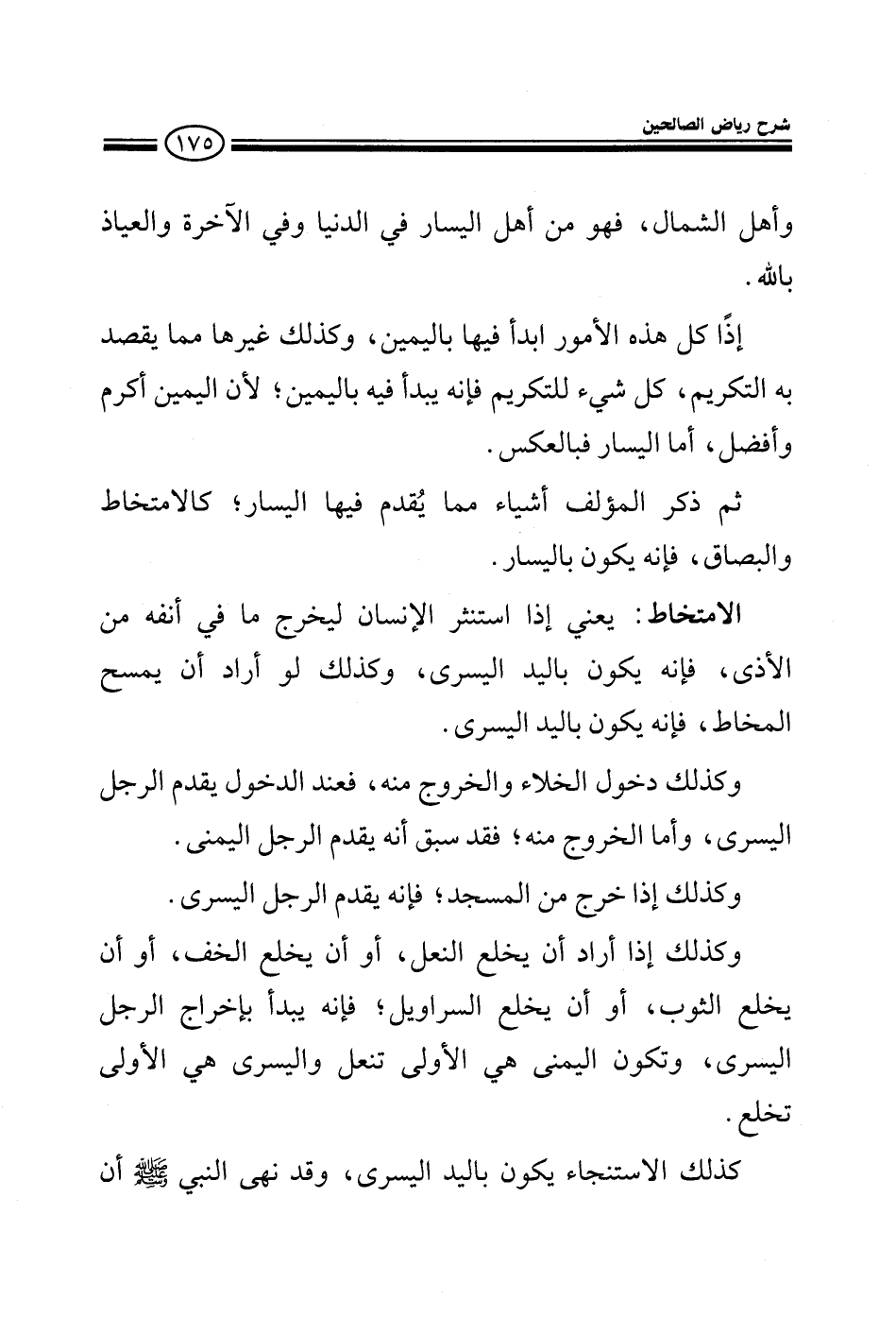 وأهل الشمال فهو من أهل اليسار في الدنيا وفي الآخرة والعياذ بالله إذا كل هذه الأمور ابدأ فيها باليمين وكذلك غيرهما مما يشمله التكريم كل شيء للتكريم فإنه يبدأ فيه باليمين لأن اليمين أكرم وأفضل أما اليسار فبالعكس ثم ذكر المؤلف أشياء مما يقدم فيها اليسار، كالامتخاط والبصاق فإنه يكون باليسار الامتخاط: يعني إذا استنثر الإنسان ليخرج ما في أنفه من الأذى فإنه يكون باليد اليسرى وكذلك لو أراد أن يمسح المخاط فإنه يكون باليد اليسرى وكذلك عند دخول الخلاء يقدم الرجل اليسرى وأما الخروج منه فقد سبق أنه يقدم الرجل اليمنى وكذلك إذا خرج من المسجد فإنه يقدم الرجل اليسرى وكذلك إذا أراد أن يخلع النعل أو أن يخلع الخف أو أن يخلع الثوب أو أن يخلع السراويل فإنه يبدأ بإخراج الرجل اليسرى وتكون اليمنى هي الأولى عند اللبس كذلك الاستنجاء يكون باليد اليسرى وقد نهى النبي صلى الله عليه وسلم أن