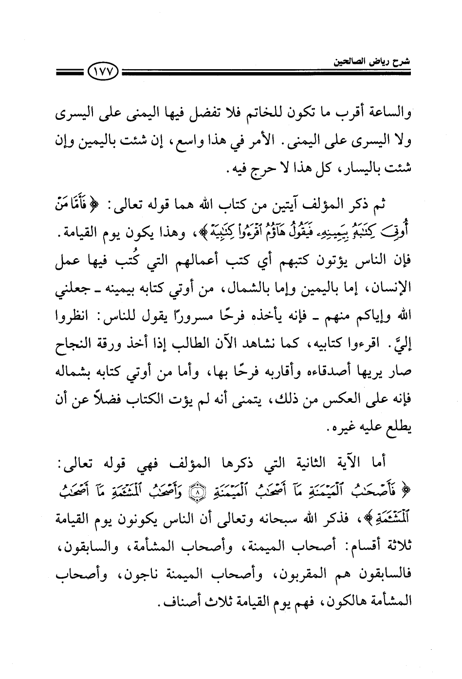 والساعة أقرب ما تكون للخاتم فلا تفضل فيها اليمنى على اليسرى ولا اليسرى على اليمنى الأمر في هذا واسع وإن شئت جعلتها باليمين وإن شئت جعلتها باليسار كل هذا لا حرج فيه ثم ذكر المؤلف آيتين من كتاب الله هما قوله تعالى: فَأَمَّا مَنْ أُوتِيَ كِتَابَهُ بِيَمِينِهِ فَيَقُولُ هَاؤُمُ اقْرَؤُوا كِتَابِيَهْ وهذا يكون يوم القيامة فإن الناس يؤتون كتبهم أي كتب أعمالهم التي كتب فيها عمل الإنسان إما باليمين وإما بالشمال {من أوتي كتابه بيمينه} جعلنا الله منهم فإنه يأخذه فرحا مسرورا يقول للناس: انظروا إلى {اقرءوا كتابيه} كما نشاهد الآن الطالب إذا أخذ ورقة النجاح صار يريها أصدقاءه وأقاربه فرحا بها {وأما من أوتي كتابه بشماله} فإنه على العكس من ذلك يتمنى أنه لم يؤت الكتاب فضلا عن أن يطلع عليه غيره والآية الأخرى التي ذكرها المؤلف فهي قوله تعالى: {فَأَصْحَابُ الْمَيْمَنَةِ مَا أَصْحَابُ الْمَيْمَنَةِ وَأَصْحَابُ الْمَشْأَمَةِ مَا أَصْحَابُ الْمَشْأَمَةِ} فذكر اله سبحانه أن الناس يكونون يوم القيامة ثلاثة أقسام: أصحاب الميمنة وأصحاب المشأمة والسابقون فالسابقون هم المقربون وأصحاب الميمنة ناجون وأصحاب المشأمة هالكون فهم يوم القيامة ثلاثة أصناف