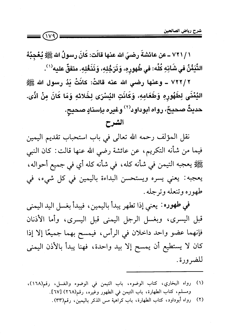 721 - وعن عائشة رضي الله عنها قالت: كان رسول الله صلى الله عليه وسلم يعجبه التيمن في شأنه في ظهوره وترجله وتنعله متفق عليه