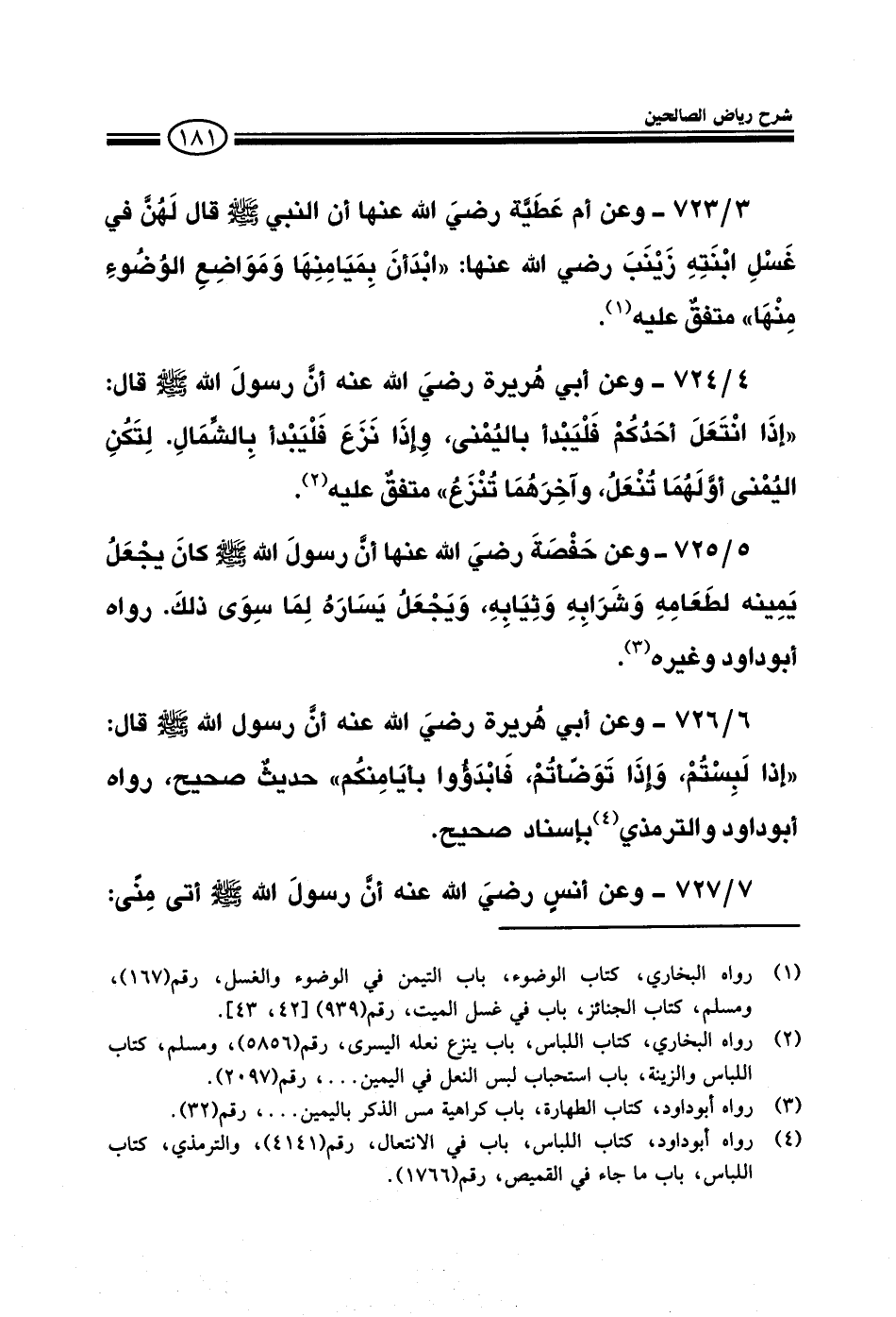 726 - وعن أبي هريرة رضي الله عنه أن رسول الله صلى الله عليه وسلم قال: إذا لبستم وإذا توضأتم فابدؤوا بأيامنكم حديث صحيح رواه أبو داود والترمذي بإسناد صحيح