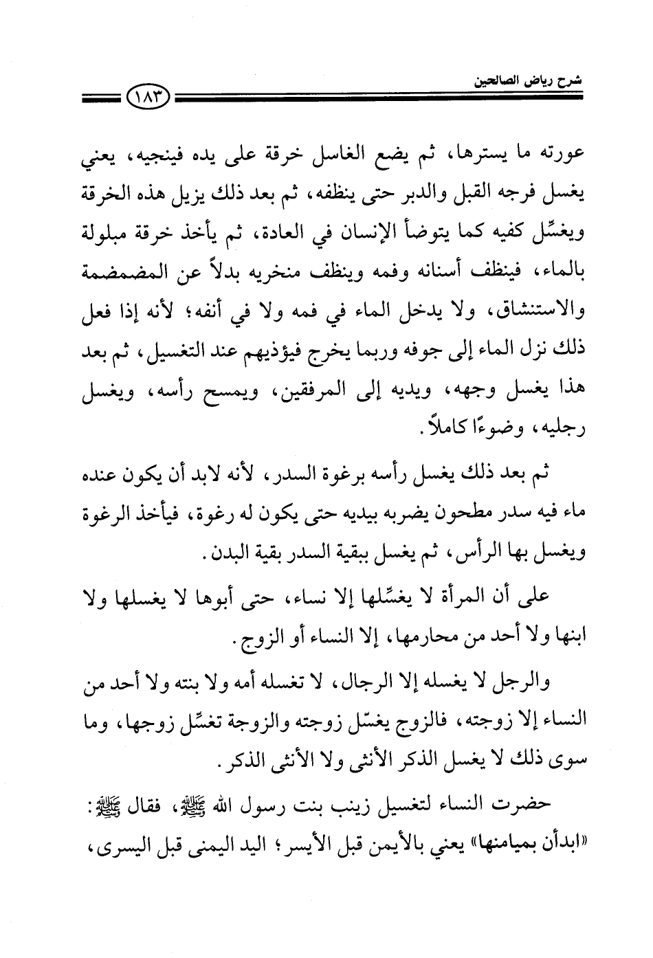 عورته ما يسترها ثم يضع الغاسل خرقة على يده فينجيه يعني يغسل فرجه القبل والدبر حتى ينظفه ثم بعد ذلك يزيل هذه الخرقة ويغسل كفيه كما يتوضأ الإنسان في العادة ثم يأخذ خرقة مبلولة بالماء فينظف أسنانه وفمه وينظف منخريه بدلا عن المضمضة والاستنشاق ولا يدخل الماء في فمه ولا في أنفه لأنه إذا فعل ذلك نزل الماء إلى جوفه وربما يخرج فيؤذيهم عند التغسيل ثم بعد هذا يغسل وجهه ويديه إلى المرفقين ويمسح رأسه ويغسل رجليه وضوءا كاملا ثم بعد ذلك يغسل رأسه برغوة السدر بعد أن يكون قد أعد ماء فيه سدر مطحون يضربه بيده حتى يكون له رغوة فيأخذ الرغوة ويغسل بها رأس الميت ثم يغسل ببقية السدر بقية البدن على أن المرأة لا يغسلها إلا نساء حتى أبوها لا يغسلها ولا ابنها ولا أحد من محارمها إلا النساء أو الزوج والرجل لا يغسله إلا رجل لا تغسله أمه ولا بنته ولا أحد من النساء إلا زوجته فالزوج يغسل زوجته والزوجة تغسل زوجها وما سوى ذلك لا يغسل الذكر الأنثى ولا الأنثى الذكر حضرت النساء لتغسيل زينب بنت الرسول صلى الله عليه وسلم فقال صلى الله عليه وسلم: ابدأن بميامنها يعني بالأيمن قبل الأيسر اليد اليمنى قبل اليسرى