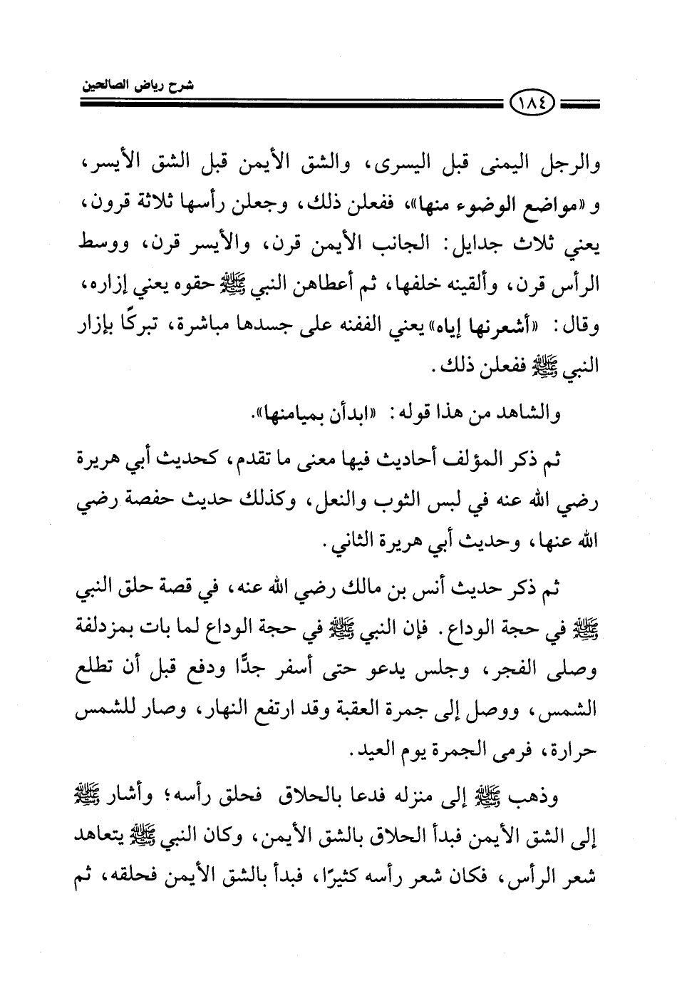 والرجل اليمنى قبل اليسرى والشق الأيمن قبل الشق الأيسر ومواضع الوضوء منها ففعلن ذلك وجعلن رأسها ثلاثة قرون يعني ثلاث جدايل الجانب الأيمن قرن والأيسر قرن ووسط الرأس قرن وألقينه خلفها ثم أعطاهن النبي صلى الله عليه وسلم حقوه يعني إزاره وقال: أشعرنها إياه يعني الففنه على جسدها مباشرة تبركا بإزار النبي صلى الله عليه وسلم ففعلن ذلك والشاهد من هذا قوله ابدأن بميامنها ثم ذكر المؤلف أحاديث فيها معنى ما تقدم كحديثي أبي هريرة رضي الله عنه في لبس الثوب والنعل والوضوء وكذلك حديث حفصة رضي الله عنها ثم ذكر حديث أنس بن مالك رضي الله عنه في قصة حلق النبي صلى الله عليه وسلم في حجة الوداع فإن النبي صلى الله عليه وسلم في حجة الوداع لما بات بمزدلفة وصلى الفجر وجلس يدعو حتى أسفر جدا ودفع قبل أن تطلع الشمس ووصل إلى جمرة العقبة وقد ارتفع النهار وصار للشمس حرارة فرمى الجمرة وذلك يوم العيد وذهب صلى الله عليه وسلم إلى منزله فدعا بالحلاق فحلق رأسه وأشار صلى الله عليه وسلم إلى الشق الأيمن فبدأ الحلاق بالشق الأيمن وكان النبي صلى الله عليه وسلم يعفي شعر الرأس فكان شعر رأسه كثيرا فبدأ بالشق الأيمن فحلقه ثم