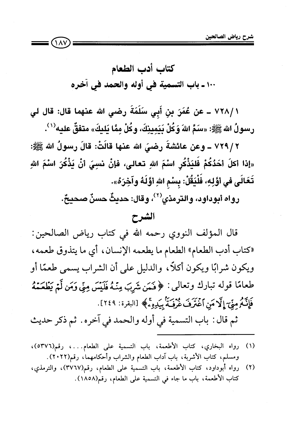 EXقال المؤلف رحمه الله (كتاب أدب الطعام) فالطعام ما يطعمه الإنسان أي ما يتذوق طعمه ويكون شرابا ويكون أكلا والدليل على أن الشراب يسمى طعما أو طعاما قوله تبارك وتعالى: فَمَن شَرِبَ مِنْهُ فَلَيْسَ مِنِّي وَمَن لَّمْ يَطْعَمْهُ فَإِنَّهُ مِنِّي إِلاَّ مَنِ اغْتَرَفَ غُرْفَةً بِيَدِهِ ثم قال: (باب التسمية في أوله والحمد في آخره) ثم ذكر حديث