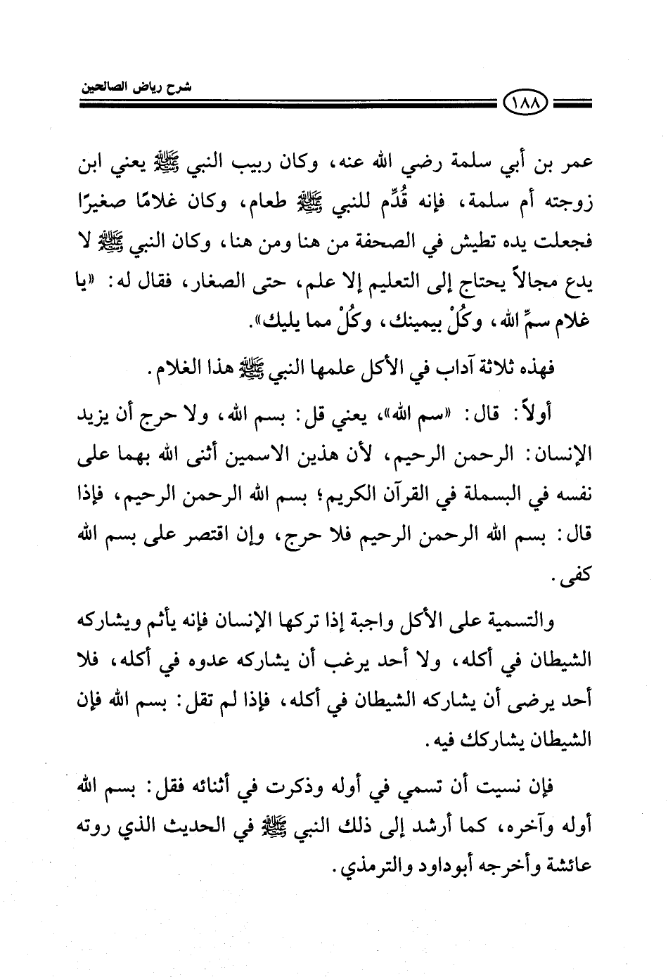 عمر بن أبي سلمة رضي الله عنه وكان ربيب النبي صلى الله عليه وسلم يعني ابن زوجته أم سلمة فإنه قدم النبي صلى الله عليه وسلم طعام وكان غلاما صغيرا فجعلت يده تطيش في الصحفة من هنا ومن هنا وكان النبي صلى الله عليه وسلم لا يدع مجالا يحتاج إلى التعليم إلا علم حتى الصغار فقال له: سم الله وكل بيمينك وكل مما يليك فهذه ثلاثة آداب في الأكل علمها النبي صلى الله عليه وسلم هذا الغلام أولا: قال: سم الله يعني قل: بسم الله ولا حرج أن يزيد الإنسان الرحمن الرحيم لأن هذين الاسمين أثنى الله بهما على نفسه في البسملة في القرآن الكريم بسم الله الرحمن الرحيم فإن قال بسم الله الرحمن الرحيم فلا حرج وإن اقتصر على بسم الله كفى والتسمية على الأكل واجبة إذا تركها الإنسان فإنه يأثم ويشاركه الشيطان في أكله ولا أحد يرضى أن يشاركه عدوه في أكله فلا أحد يرضى أن يشاركه الشيطان في أكله فإذا لم تقل: بسم الله فإن الشيطان يشاركك فيه فإن نسيت أن تسمى في أوله وذكرت في أثنائه فقل: بسم الله أوله وآخره كما أرشد إلى ذلك النبي صلى الله عليه وسلم في الحديث الذي روته عائشة وأخرجه أبو داود والترمذي