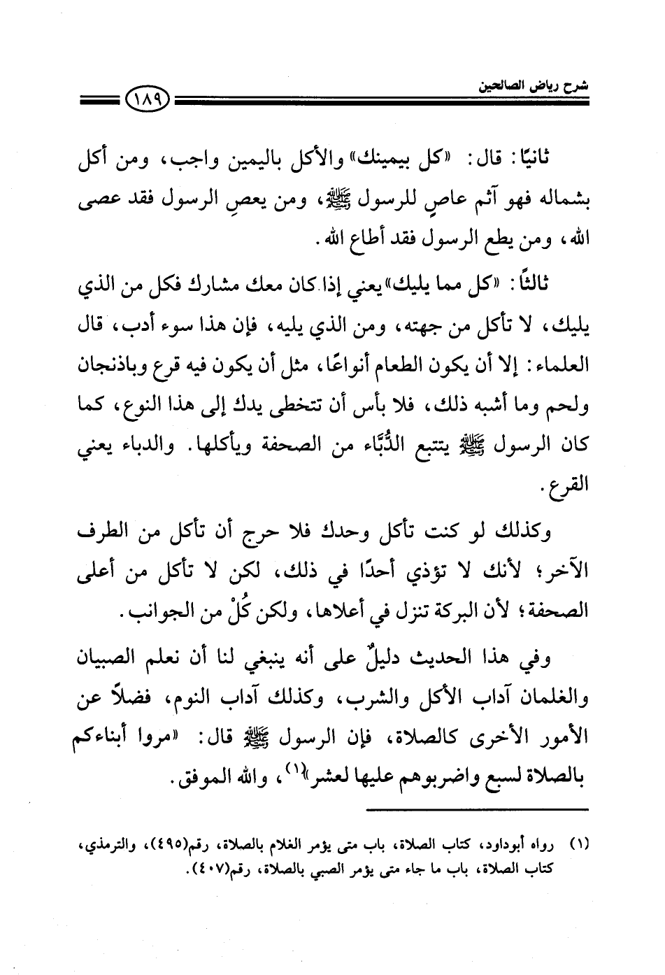 ثانيا: قال: كل بيمينك والأكل باليمين واجب ومن أكل بشماله فهو آثم عاص للرسول صلى الله عليه وسلم ومن عصى الرسول فقد عصى الله ومن يطع الرسول فقد أطاع الله ثالثا: كل مما يليك يعني إذا كان معك مشارك فكل من الذي يليك لا تأكل من جهته، ومن الذي يليه فإن هذا سوء أدب قال العلماء: إلا أن يكون الطعام أنواعا مثل أن يكون فيه قرع وباذنجان ولحم وغيره فلا بأس أن تتخطى يدك إلى هذا النوع أو ذاك كما كان الرسول صلى الله عليه وسلم يتتبع الدباء من الصحفة يأكلها والدباء يعني القرع وكذلك لو كنت تأكل وحدك فلا حرج أن تأكل من الطرف الآخر لأنك لا تؤذي أحدا في ذلك لكن لا تأكل من أعلى الصحفة لأن البركة تنزل في أعلاها ولكن كل من الجوانب وفي هذا الحديث: دليل على أنه ينبغي لنا أن نعلم الصبيان والغلمان آداب الأكل والشرب وكذلك آداب النوم فضلا عن الأمور الأخرى كالصلاة فإن الرسول صلى الله عليه وسلم قال مروا أبناءكم بالصلاة لسبع واضربوهم عليها لعشر