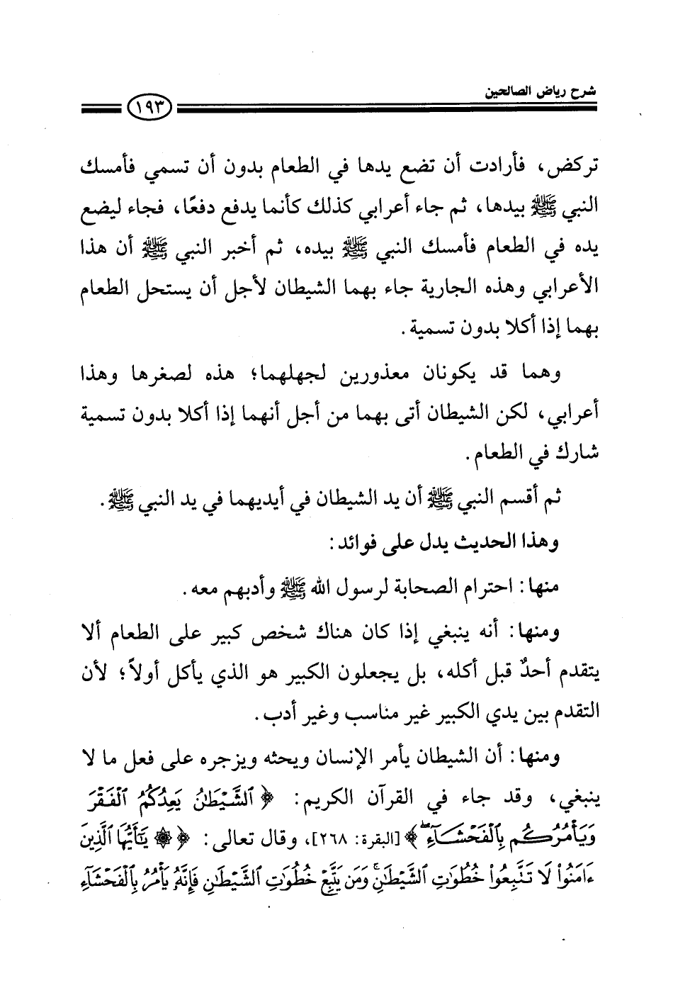 تركض فأرادت أن تضع يدها في الطعام بدون أن تسمى فأمسك النبي صلى الله عليه وسلم بيدها ثم جاء أعرابي كذلك كأنما يدفع دفعا فجاء يده في الطعام فأمسك النبي صلى الله عليه وسلم بيده ثم أخبر النبي صلى الله عليه وسلم أن هذا الأعرابي وهذه الجارية جاء بهما الشيطان لأجل أن يستحل الطعام بهما إذا أكلا بدون تسمية وهما قد يكونان معذورين لجهلهما هذه لصغرها وهذا أعرابي لكن الشيطان أتى بهما من أجل أنهما إذا أكلا بدون تسمية شارك في الطعام ثم أقسم النبي صلى الله عليه وسلم أن يد الشيطان مع أيديهما في يد النبي صلى الله عليه وسلم وهذا الحديث يدل على فوائد: منها: احترام الصحابة لرسول الله صلى الله عليه وسلم وأدبهم معه.