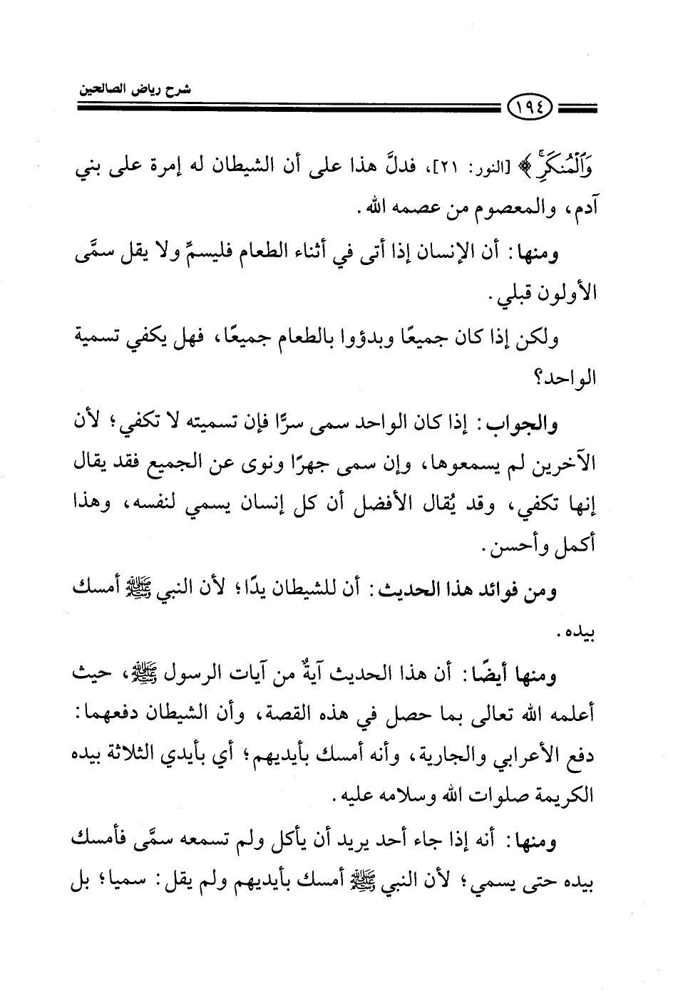 وَالْمُنْكَرِ} فدل هذا على أن الشيطان له إمرة على بني آدم والمعصوم من عصمه الله ومنها: أن الإنسان إذا أتى في أثناء الطعام فليسم ولا يقل سمى الأولون قبلي ولكن إذا كانوا جميعا وبدؤوا بالطعام جميعا فهل يكفى تسمية الواحد؟ والجواب: إن كان الواحد سمى سرا فإن تسميته لا تكفى لأن الآخرين لم يسمعوها وإن سمى جهرا ونوى عن الجميع فقد يقال إنها تكفي وقد يقال الأفضل أن يسمي كل إنسان لنفسه وهذا أكمل وأحسن.