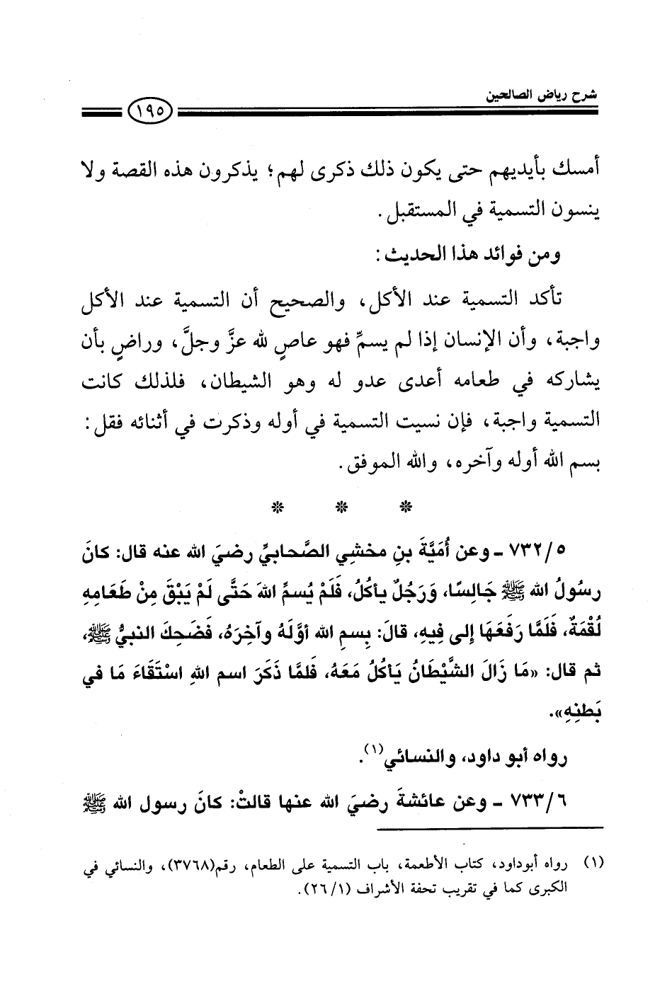 732 - وعن أمية بن مخشي الصحابي رضي الله عنه قال: كان رسول صلى الله عليه وسلم جالسا ورجل يأكل فلم يسم الله حتى لم يبق من طعامه لقمة فلما رفعها إلى فيه قال: بسم الله أوله وآخره فضحك النبي صلى الله عليه وسلم ثم قال: ما زال الشيطان يأكل معه فلما ذكر اسم الله استقاء ما في بطنه رواه أبو داود والنسائي