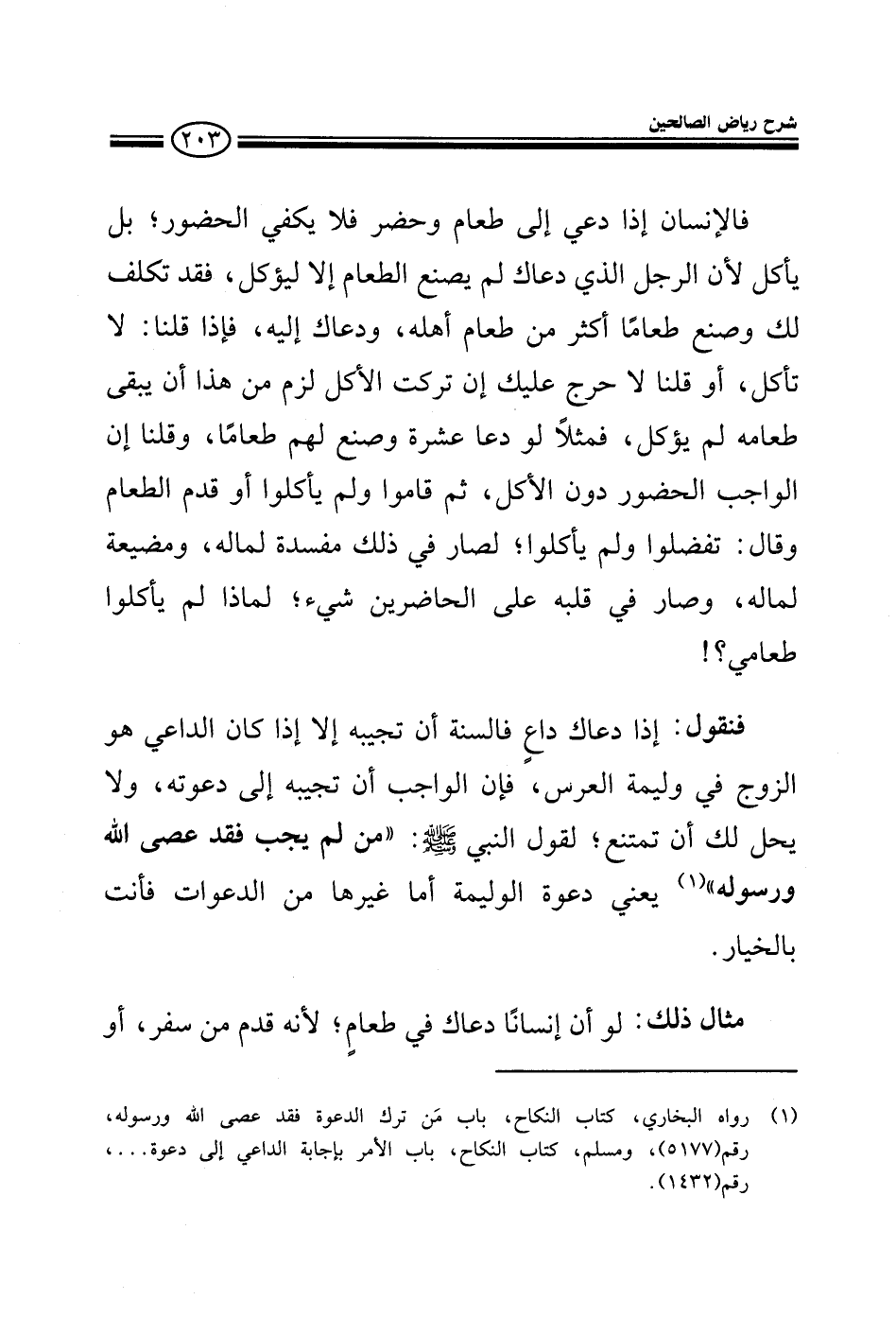فالإنسان إذا دعي إلى الطعام وحضر فلا يكفي الحضور بل يأكل لأن الرجل الذي دعاك لم يصنع الطعام إلا ليؤكل فقد تكلف لك وصنع طعاما أكثر من طعام أهله ودعاك إليه فإذا قلنا لا حرج عليك إن تركت الأكل لزم من هذا أن يبقى طعامه لم يؤكل فمثلا لو دعا عشرة وصنع لهم طعاما وقلنا إن الواجب الحضور دون الأكل ثم قاموا ولم يأكلوا لصار في ذلك مفسدة لماله ومضيعة لماله وصار في قلبه على الحاضرين شيء لماذا لم يأكلوا طعامي؟ فتقول إذا دعاك داع فالسنة أن تجيبه إلا إذا كان الداعي هو الزوج في وليمة العرس فإن الواجب أن تجيبه إلى دعوته ولا يحل لك أن تمنع لقول النبي صلى الله عليه وسلم: من لم يجب فقد عصى الله ورسوله يعني دعوة الوليمة أما غيرها من الدعوات فأنت بالخيار مثل ذلك لو أن إنسانا دعاك في طعام لأنه قدم من سفر أو