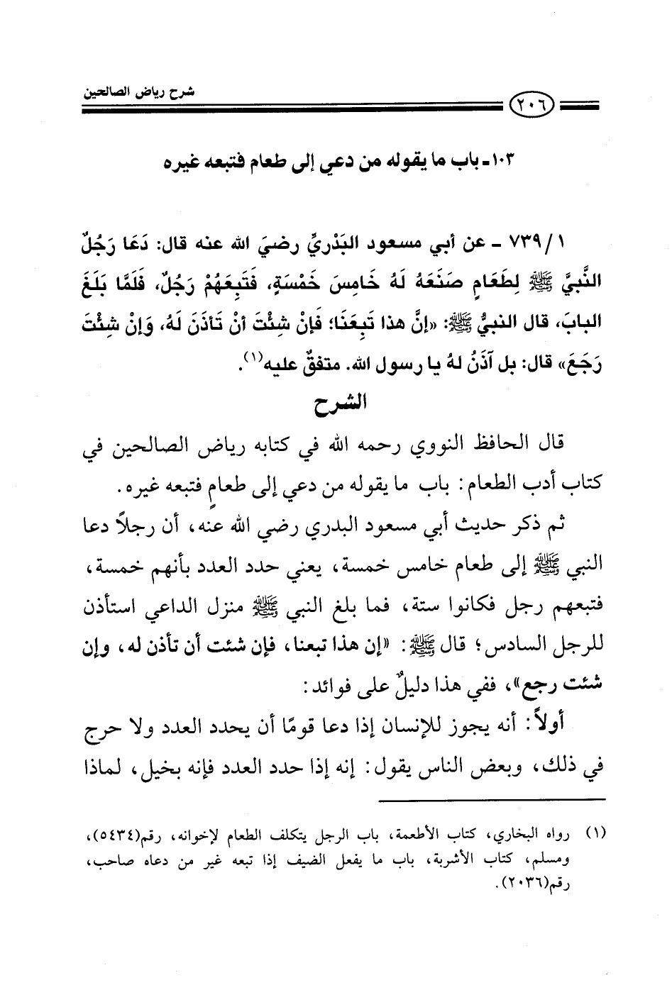 739 - عن أبي مسعود البدري رضي الله عنه قال: دعا رجل النبي صلى الله عليه وسلم لطعام صنعه له خامس خمسة فتبعهم رجل فلما بلغ الباب قال له النبي صلى الله عليه وسلم: إن هذا تبعنا فإن شئت أن تأذن له وإن شئت رجع قال: بل آذن له يا رسول الله متفق عليه