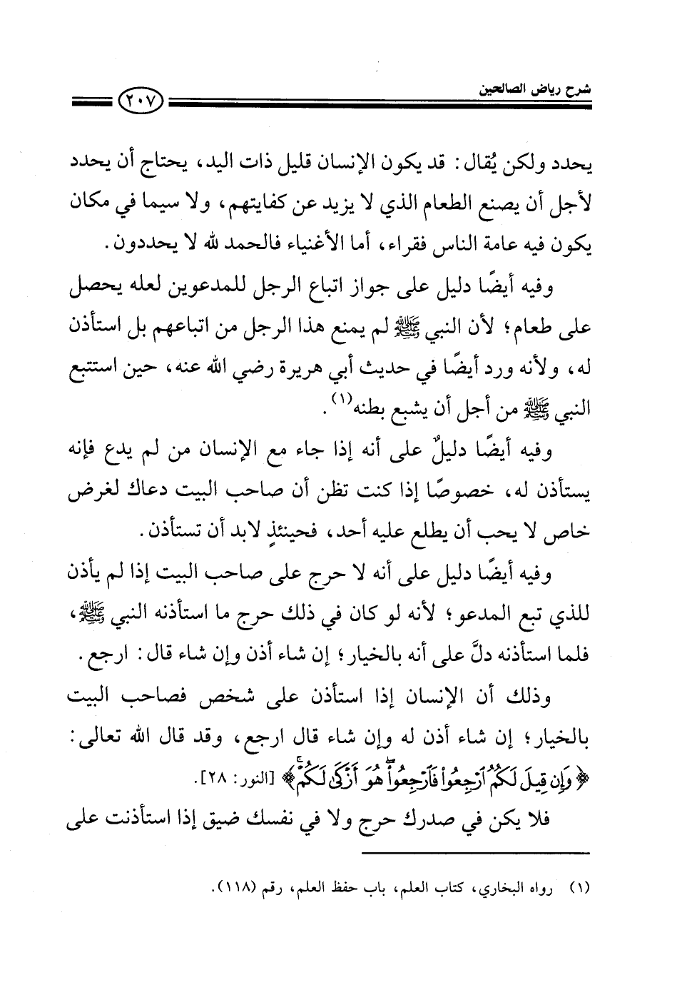 ولكن يقال قد يكون الإنسان قليل ذات اليد يحتاج أن يحدد لأجل أن يصنع الطعام الذي لا يزيد عن كفايتهم ولا سيما في مكان يكون فيه عامة الناس فقراء أما الأغنياء فالحمد لله لا يحددون وفيه أيضا: دليل على جواز اتباع الرجل للمدعوين لعله يحصل علي طعام لأن النبي صلى الله عليه وسلم لم يمنع هذا الرجل من اتباعهم بل استأذن له ولأنه ورد أيضا في حديث أبي هريرة رضي الله عنه حين تبع النبي صلى الله عليه وسلم من أجل أن يشبع بطنه وفيه أيضا: دليل على أنه إذا جاء مع الإنسان من لم يدع فإنه يستأذن له خصوصا إذا كنت تظن أن صاحب البيت دعاك لغرض خاص لا يجب أن يطلع عليه أحد فحينئذ لابد أن تستأذن وفيه أيضا: دليل على أنه لا حرج علي صاحب البيت إذا لم يأذن للذي تبع المدعو لأنه لو كان في ذلك حرج ما استأذنه النبي صلى الله عليه وسلم فلما استأذنه دل على أنه بالخيار إن شاء أذن وإن شاء قال ارجع وذلك أن الإنسان إذا استأذن علي شخص فصاحب البيت بالخيار إن شاء أذن له وإن شاء قال ارجع وقد قال الله تعالى: وَإِن قِيلَ لَكُمْ ارْجِعُوا فَارْجِعُوا هُوَ أَزْكَى لَكُمْ فلا يكن في صدرك حرج ولا في نفسك ضيق إذا استأذنت علي