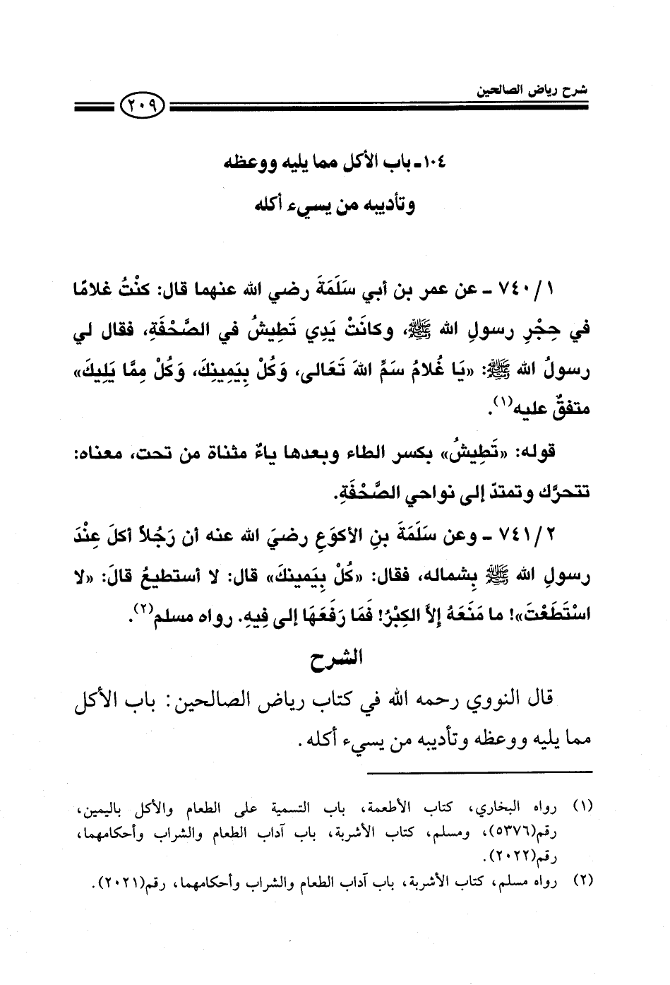 740 - عن عمر بن أبي سلمة رضي الله عنهما قال: كنت غلاما في حجر رسول الله صلى الله عليه وسلم وكانت يدي تطيش في الصحفة فقال لي رسول الله صلى الله عليه وسلم يا غلام سم الله تعالى وكل بيمينك وكل مما يليك متفق عليه قوله: تطيش بكسر الطاء وبعدها ياء مثناه من تحت معناه تتحرك وتمتد إلى نواحي الصحفة
