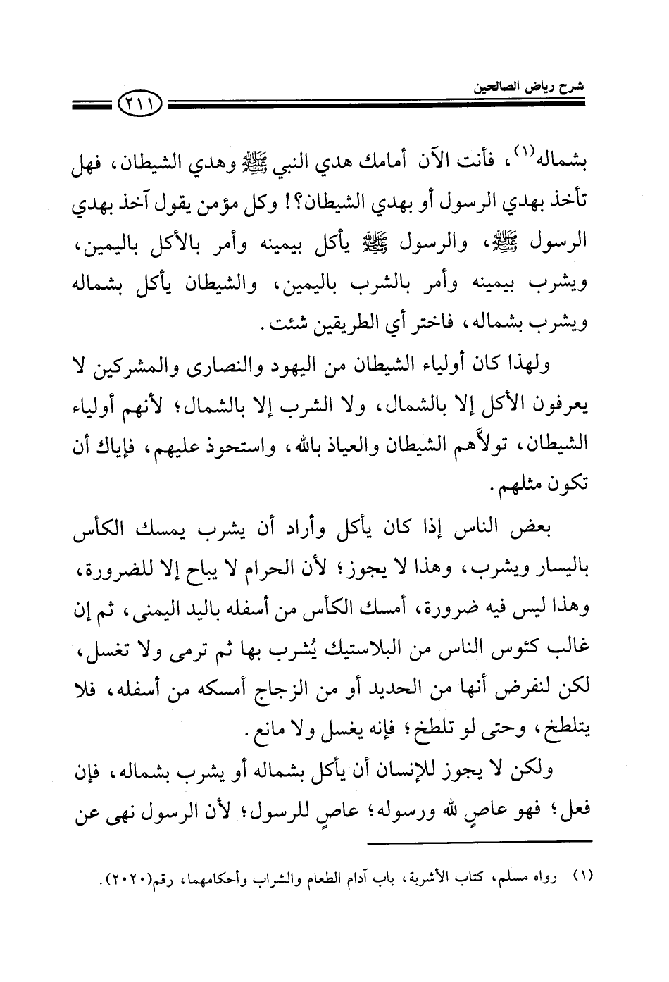 بشماله فأنت الآن أمامك هدي النبي صلى الله عليه وسلم وهدي الشيطان فهل تأخذ بهدي الرسول أو بهدي الشيطان؟ وكل مؤمن يقول آخذ بهدي الرسول صلى الله عليه وسلم والرسول صلى الله عليه وسلم يأكل بيمينه وأمر بالأكل باليمين ويشرب بيمينه وأمر بالشرب باليمين والشيطان يأكل بشماله ويشرب بشماله فاختر أي الطريقين شئت ولهذا كان أولياء الشيطان من اليهود والنصارى والمشركين لا يعرفون الأكل إلا بالشمال ولا الشرب إلا بالشمال لأنهم أولياء الشيطان تولاهم الشيطان والعياذ بالله واستحوذ عليهم فإياك أن تكون مثلهم وبعض الناس إذا كان يأكل وأراد أن يشرب يمسك الكأس باليسار ويشرب وهذا لا يجوز لأن الحرام لا يباح إلا للضرورة وهذا ليس له ضرورة يستطيع أن يمسك الكأس من أسفله باليد اليمنى فغالب كئوس الناس اليوم إما من البلاستك يشرب بها ثم ترمي ولا تغسل أو من الحديد أو الزجاج فيمكن غسلها حتى لو تلطخت ولكن لا يجوز للإنسان أن يأكل بشماله أو يشرب بشماله فإن فعل فهو عاص لله ورسوله عاص للرسول لأنه نهى عن