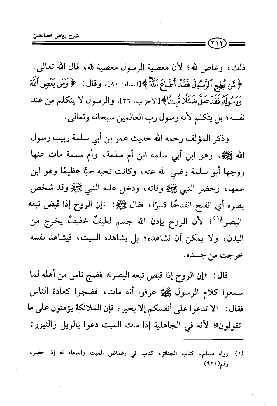 ذلك وعاص لله لأن معصية الرسول معصية لله قال الله تعالى: من يطع الرسول فقد أطاع الله وقال: {ومن يعص الله ورسوله فقد ضل ضلالا مبينا} والرسول ما يتكلم من عند نفسه بل يتكلم لأنه رسول رب العالمين سبحانه وتعالى وذكر المؤلف رحمه الله حديث عمر بن أبي سلمة ربيب رسول الله صلى الله عليه وسلم وعمر بن أبي سلمة بن أم سلمة وأم سلمة مات عنها زوجها أبو سلمة رضي الله عنه وكانت تحبه حبا عظيما وهو ابن عمها وحضر النبي صلى الله عليه وسلم وفاته ودخل عليه النبي صلى الله عليه وسلم وقد شخص بصره أي انفتح انفتح انفتاحا كبيرا فقال صلى الله عليه وسلم: إن الروح إذا قبض تبعه البصر لأن الروح بإذن الله جسم لطيف خفيف يخرج من البدن ولا يمكن أن نشاهده بل يشاهده الميت فيشاهد نفسه خرجت من جسده قال: إن الروح إذا قبضت تبعها البصر فضج ناس من أهله لما سمعوا كلام الرسول صلى الله عليه وسلم عرفوا أنه مات فضجوا كعادة الناس لأنه في الجاهلية إذا مات الميت دعوا بالويل والثبور